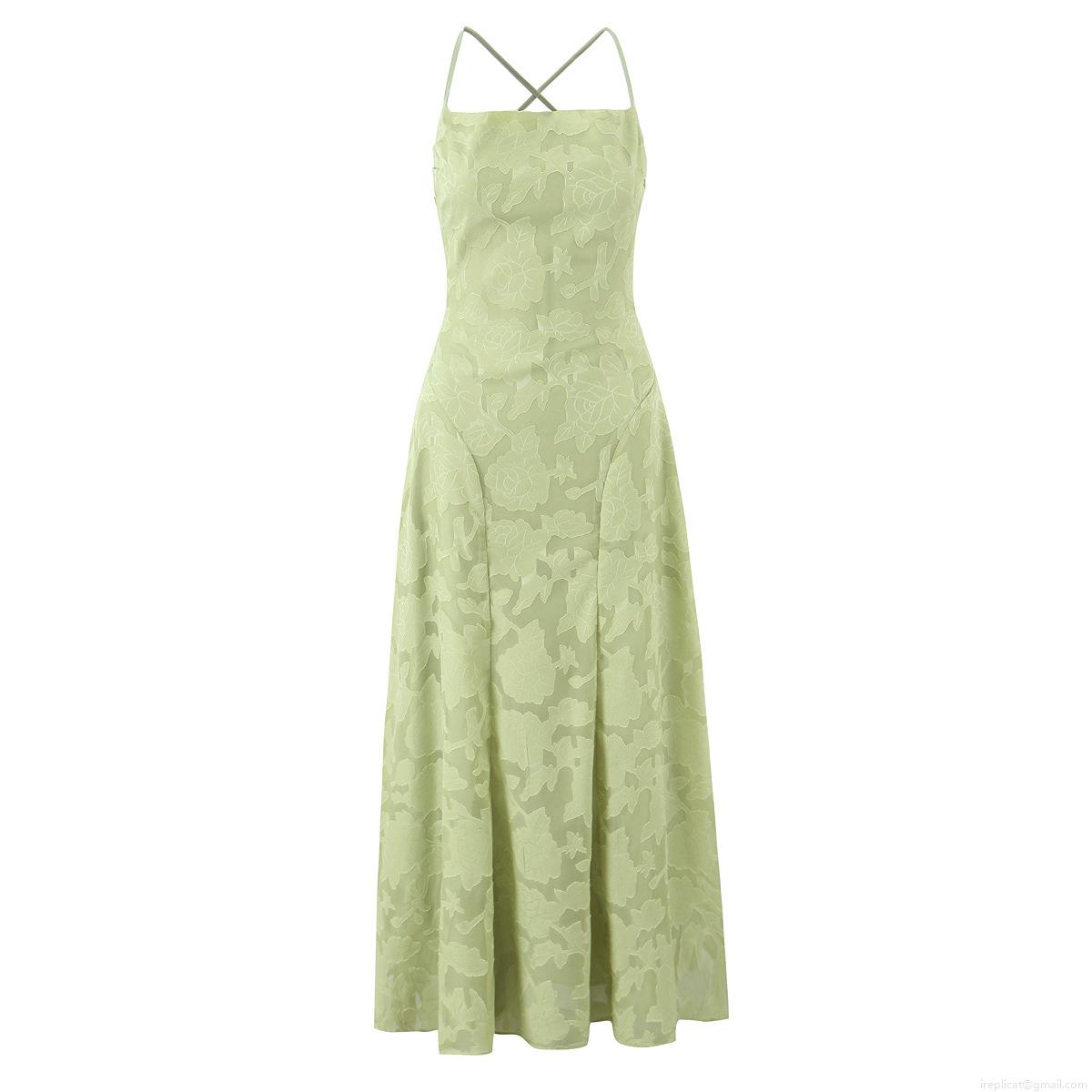 Elegant Women Light Green Floral Jacquard Maxi Dress Sexy Backless Cross Strap Cami Dress High Waist Wedding Party Evening Long Dress