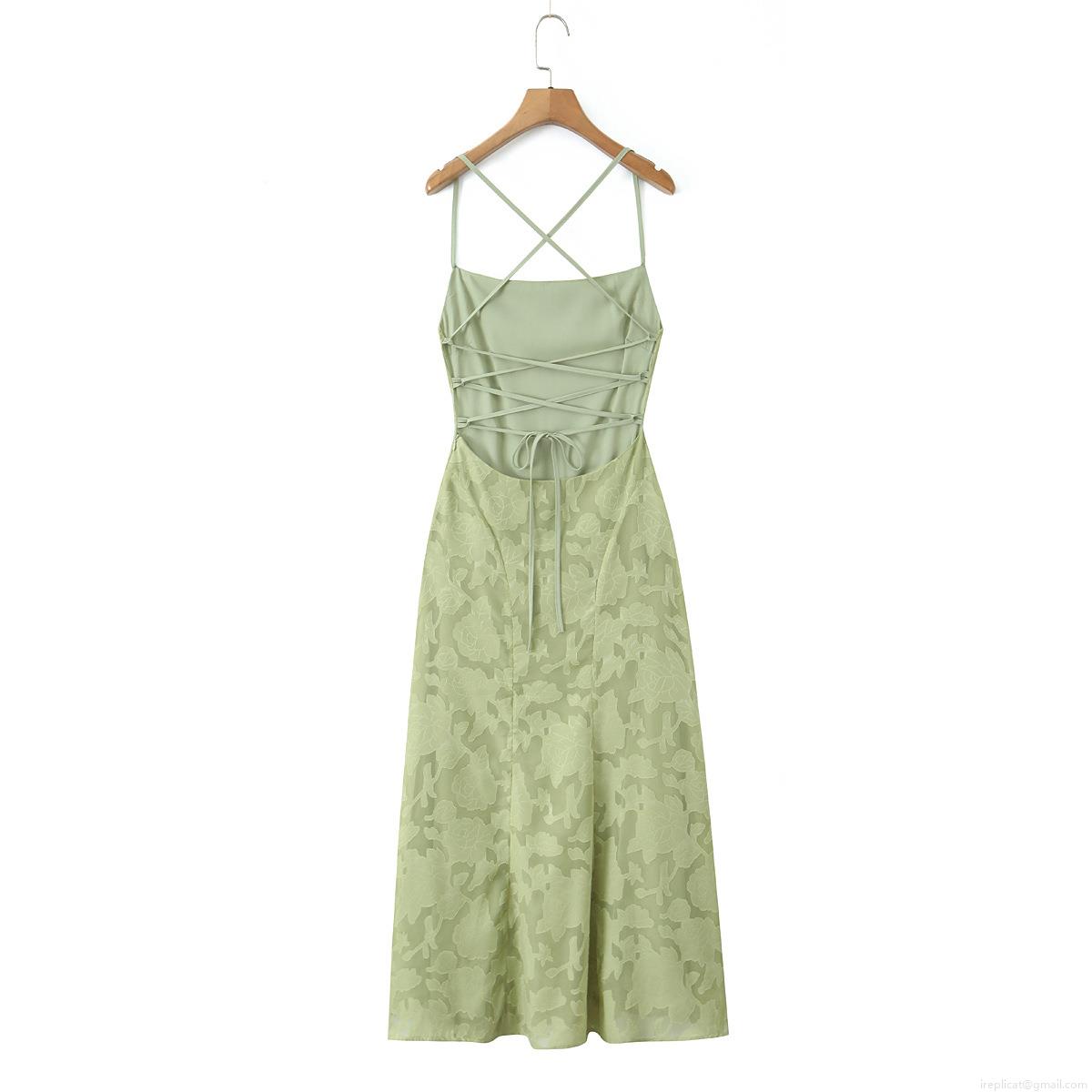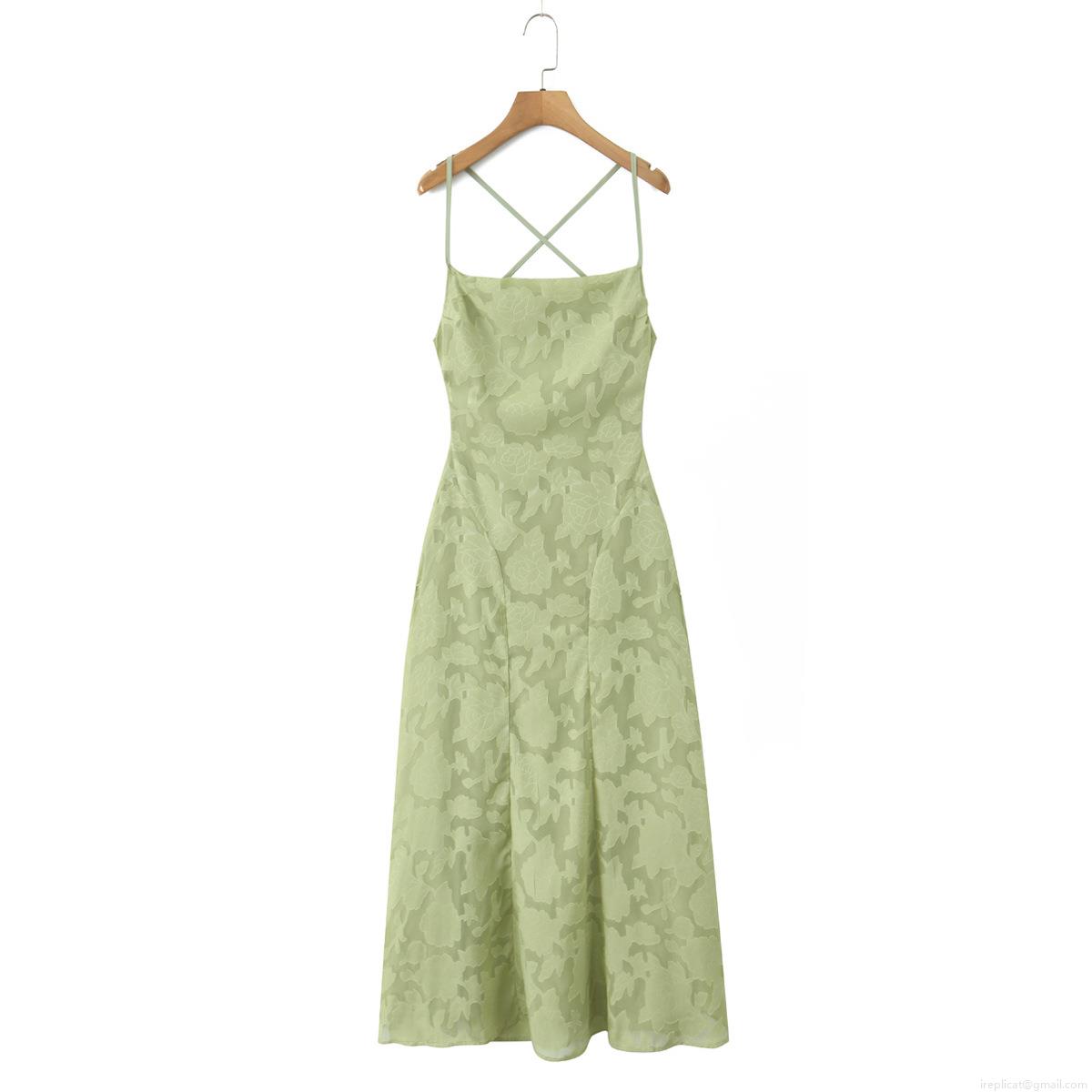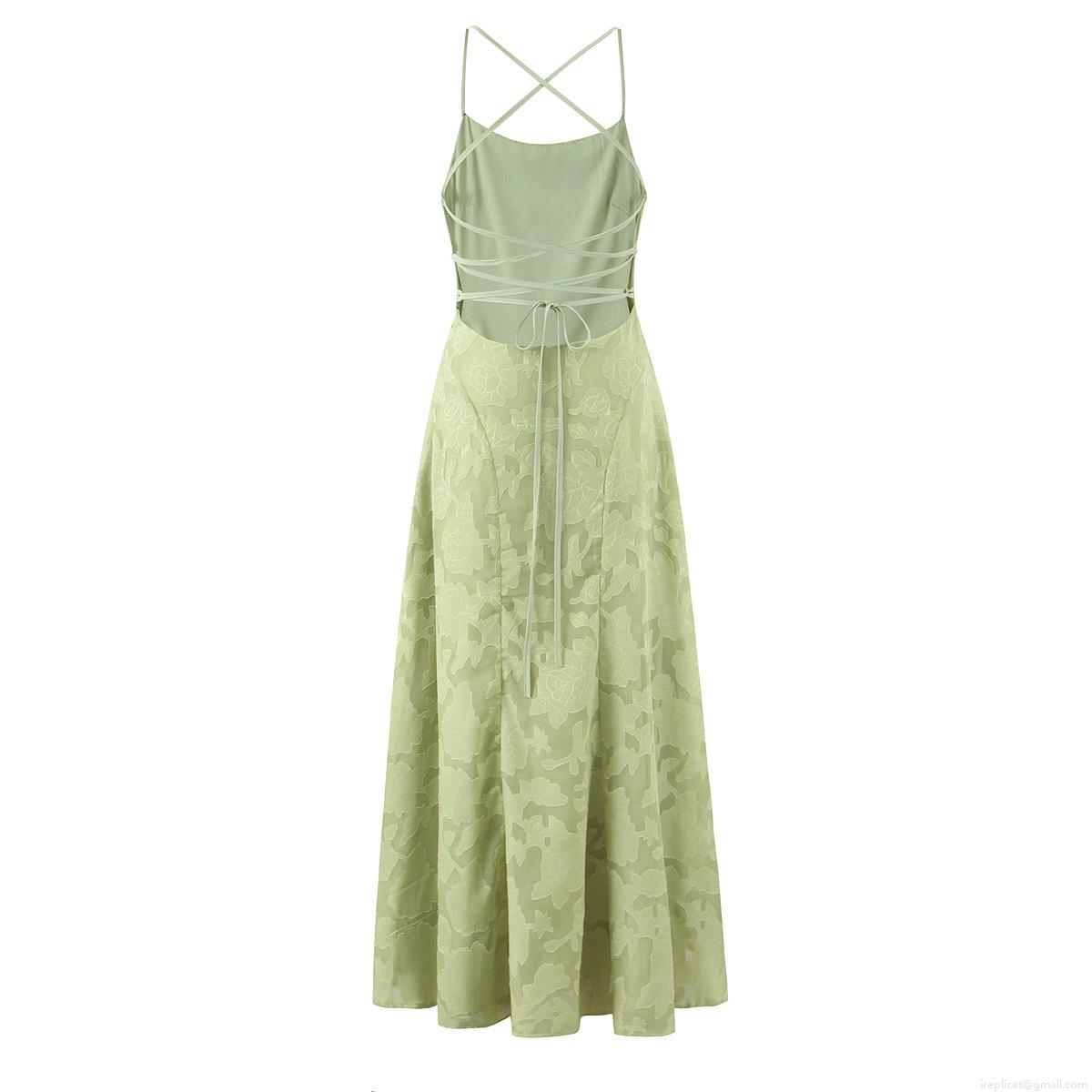 • Elegant Women Light Green Floral Jacquard Maxi Dress Sexy Backless Cross Strap Cami Dress High Waist Wedding Party Evening Long Dress