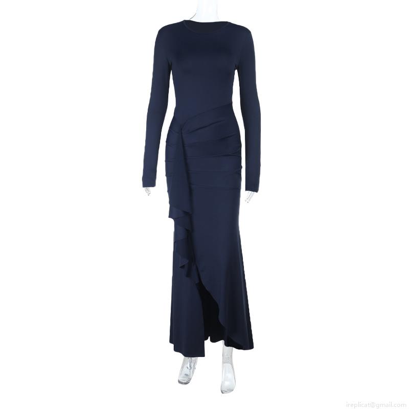 Elegant Women Long Sleeve Ruffle Maxi Dress Polyester Spandex Slim Fit Ruched Bodycon Evening Party Wedding Formal Fishtail Gown Dress