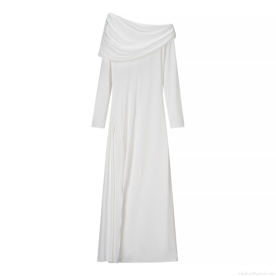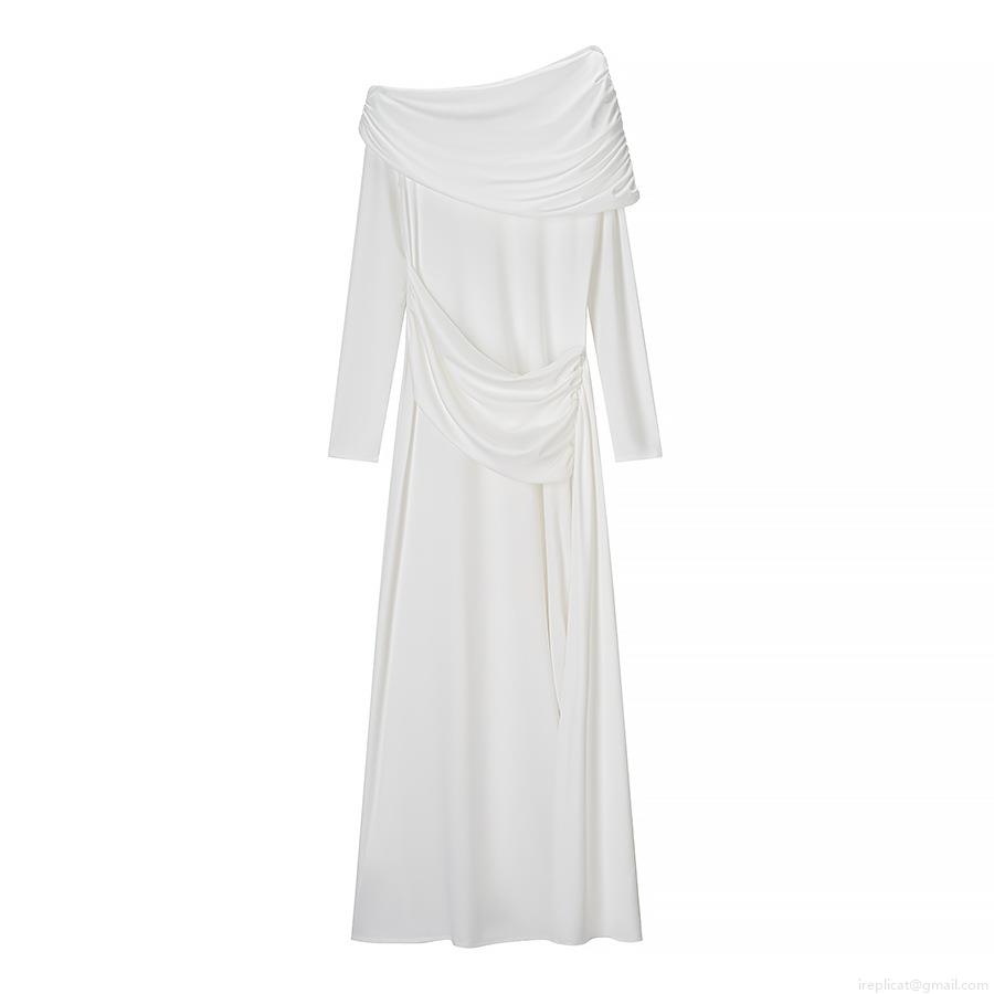 Elegant Women Off Shoulder Asymmetric Ruched Maxi Dress Sexy Long Sleeve Bodycon Polyester Evening Party Streetwear Solid Color White Long Dress