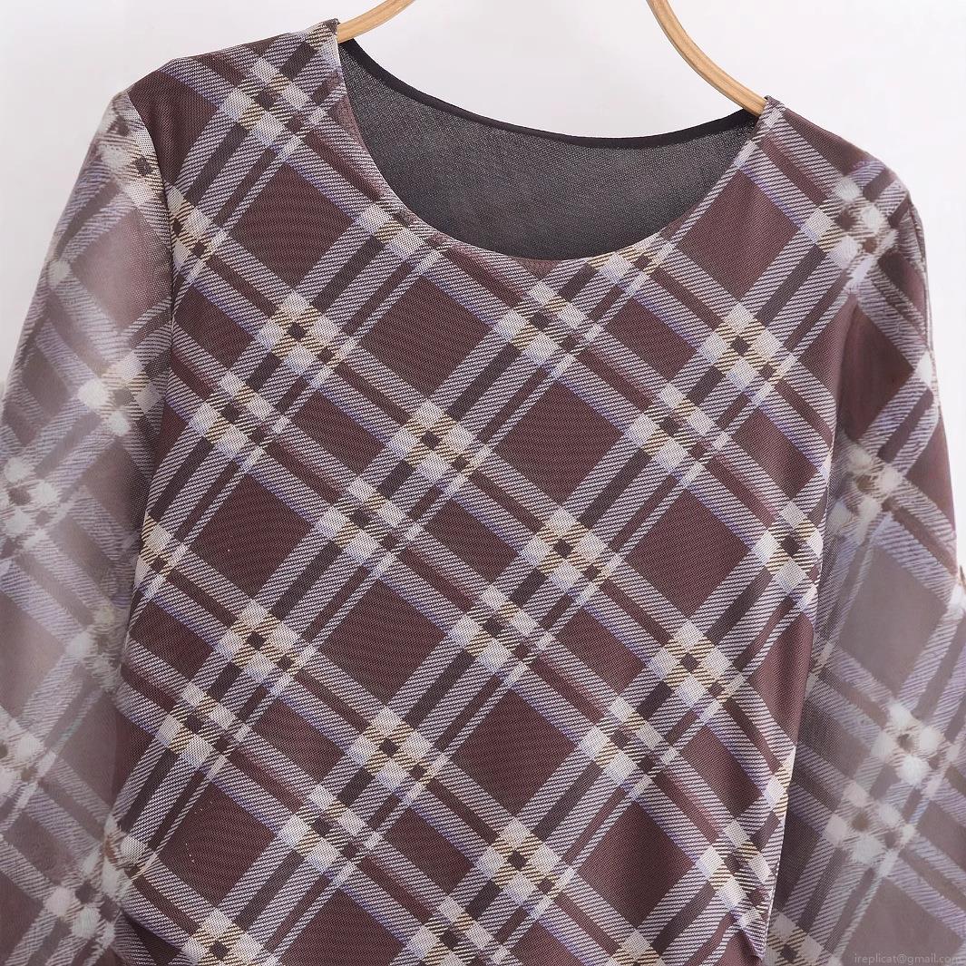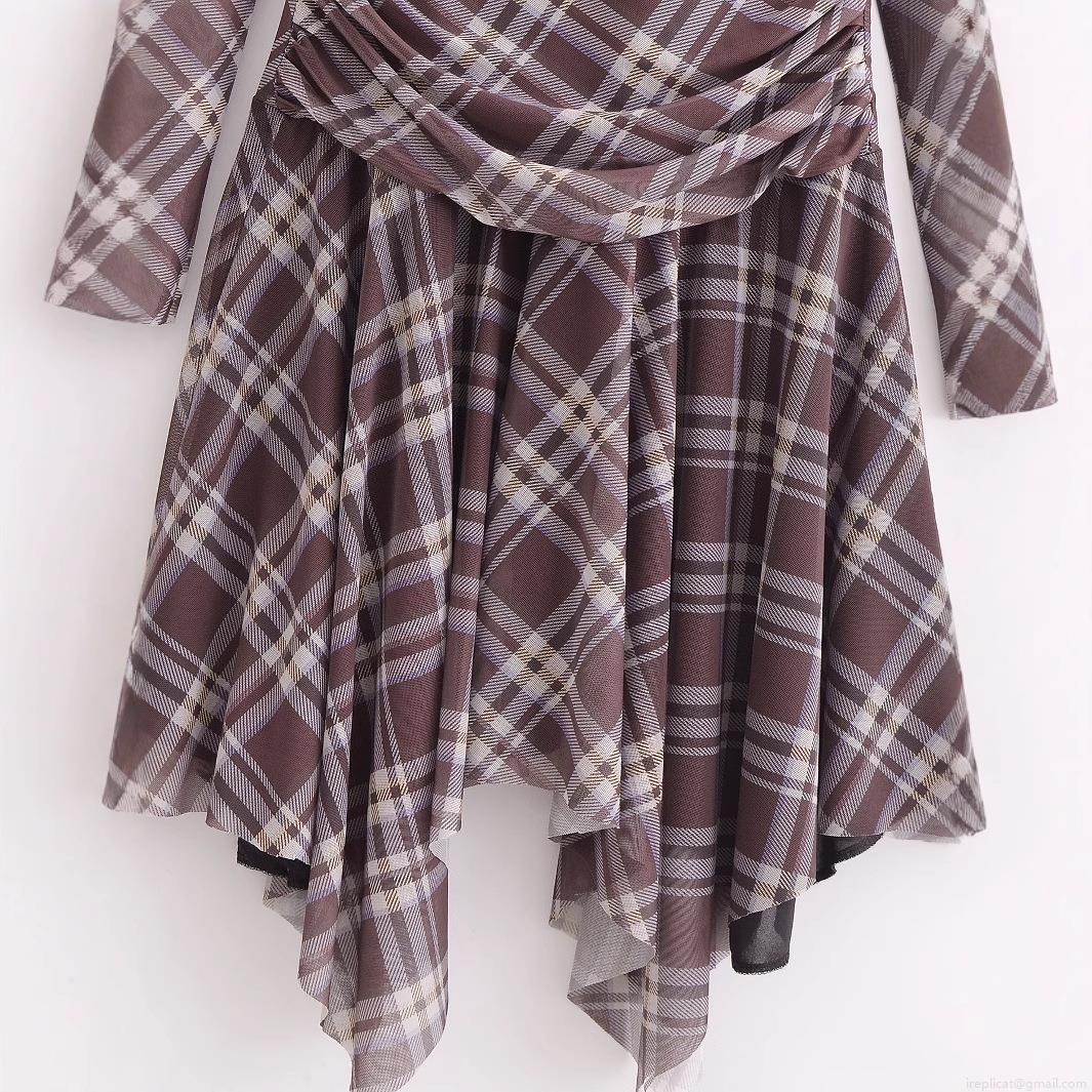 • Elegant Women Plaid Mesh Ruched Long Sleeve Maxi Dress Retro Round Neck Irregular Hem 100% Polyester Bodycon Party Long Dresses