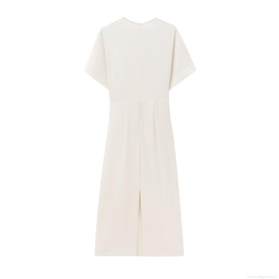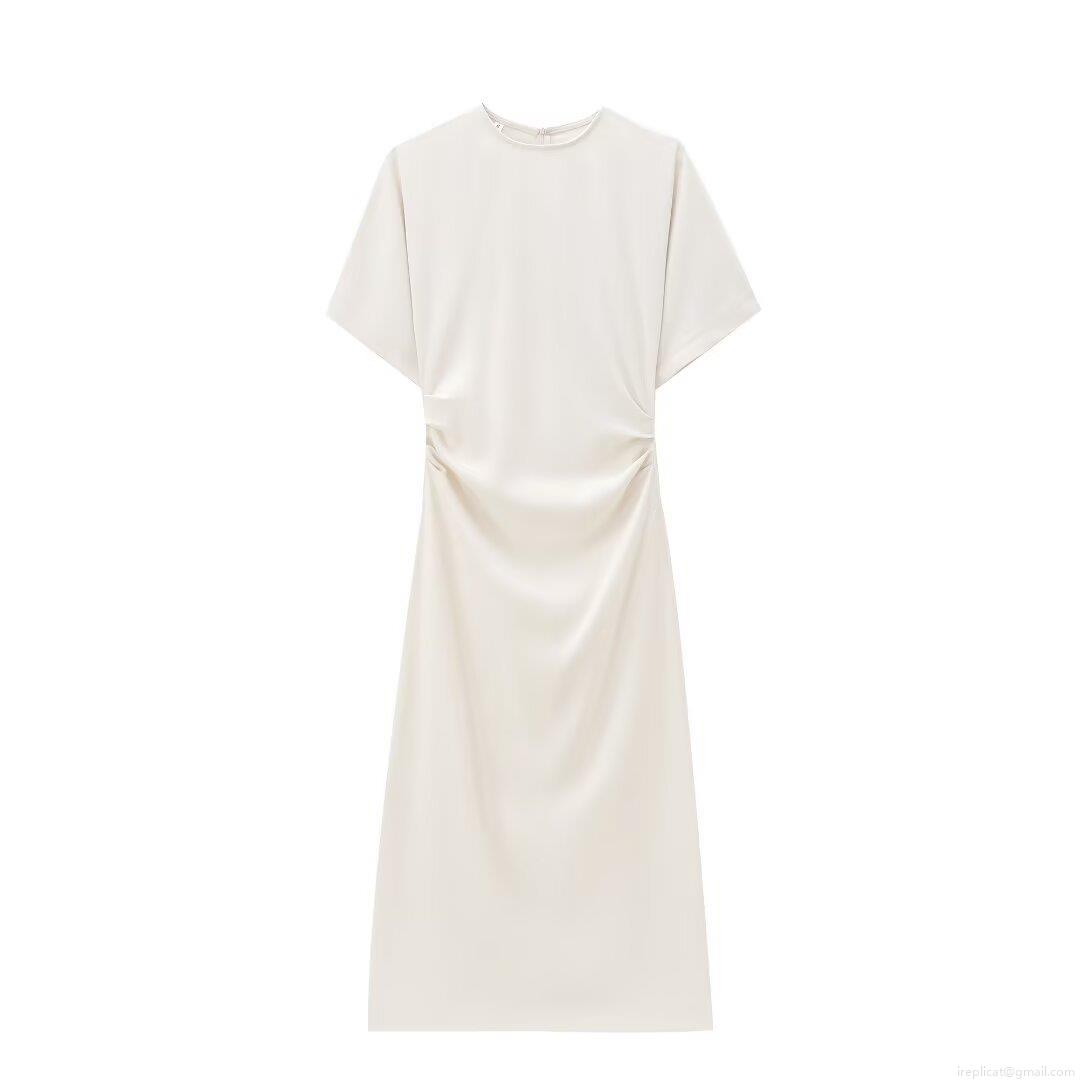 • Elegant Women Pleated Bodycon Maxi Dress Short Sleeve Round Neck Slim Fit Evening Party Dating Dress With Back Zipper Slit Hem Polyester Cream White