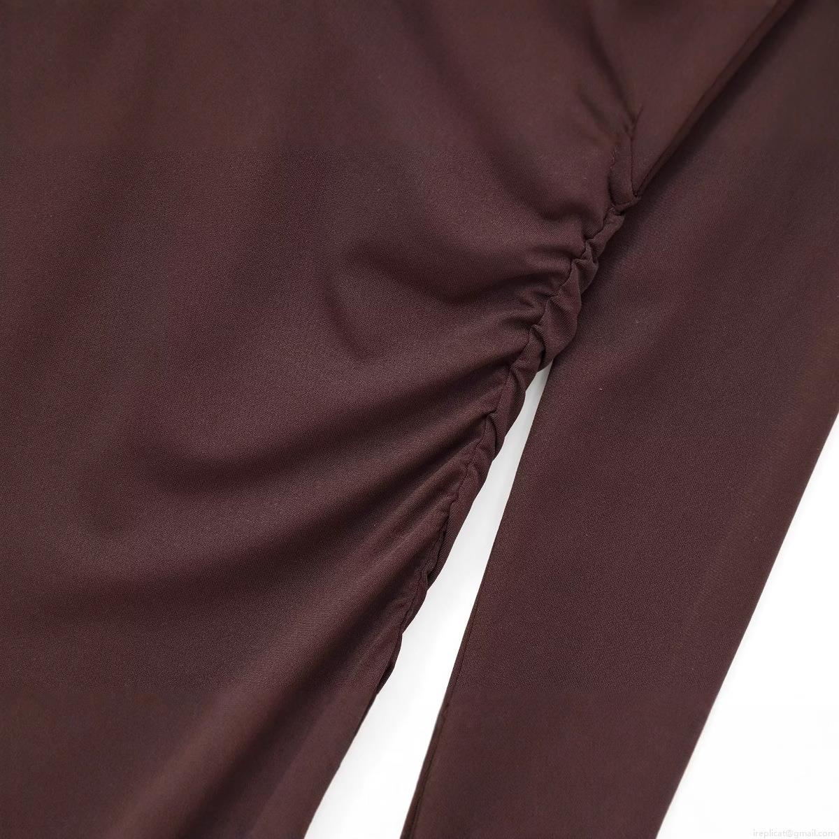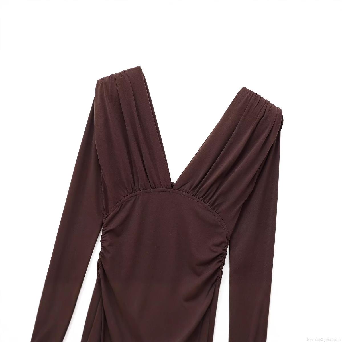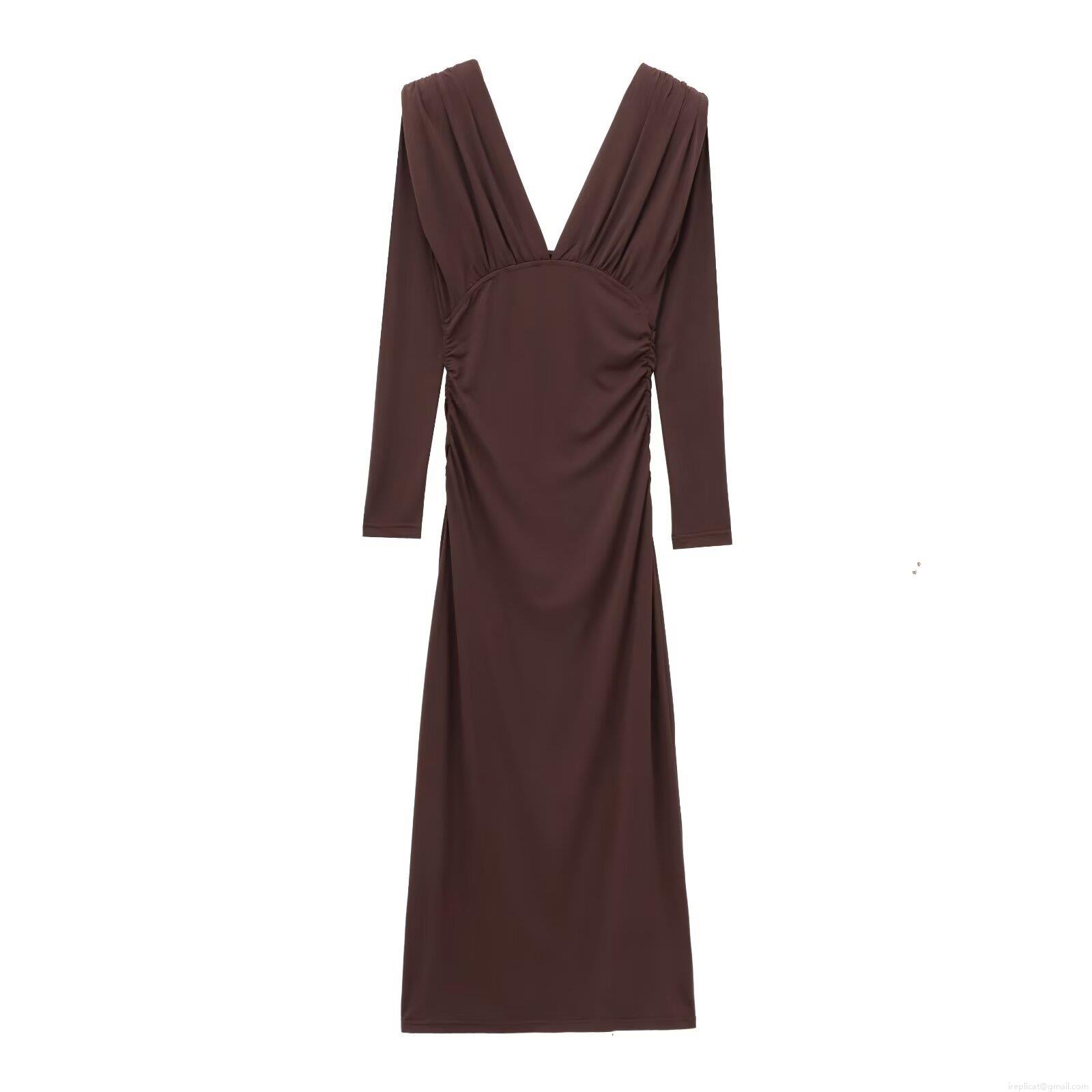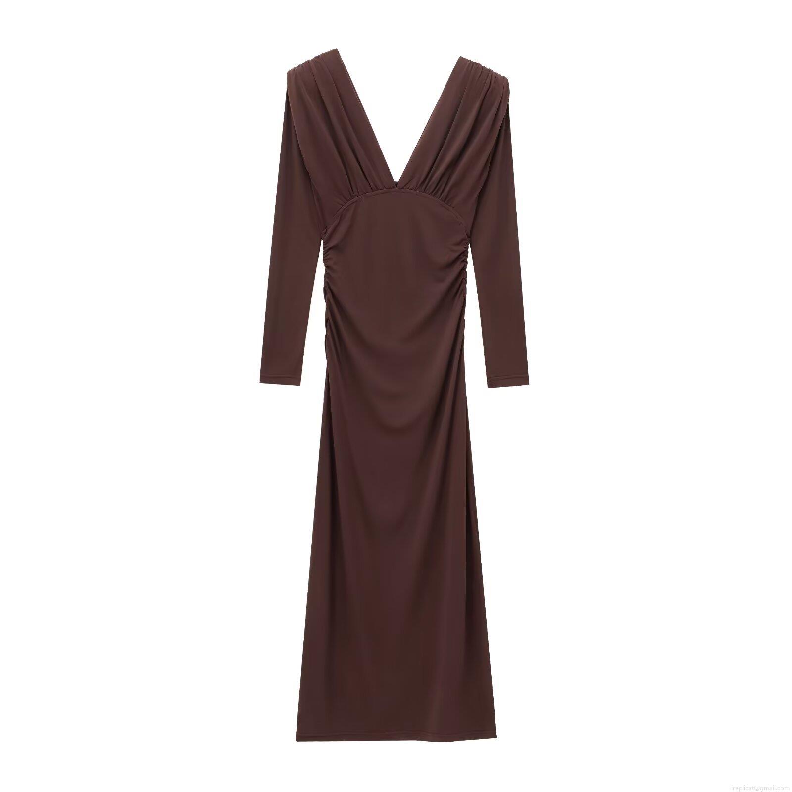 • Elegant Women Ruched Maxi Dress Deep V Neck Shoulder Padded Long Sleeve Bodycon Solid Coffee Party Evening Long Dress