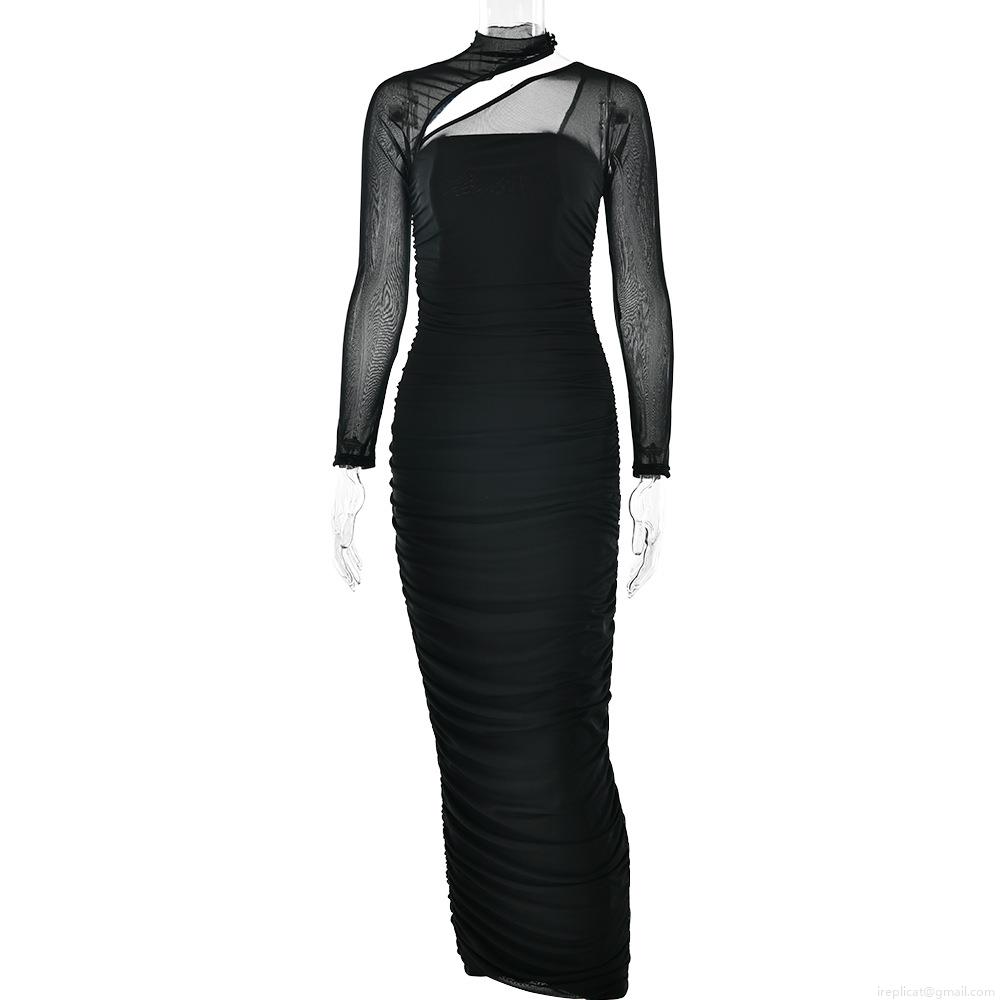• Elegant Women Ruched Maxi Dress Mesh Patchwork Backless Hollow Out Long Sleeve Bodycon Evening Party Gown For Wedding Club Wear