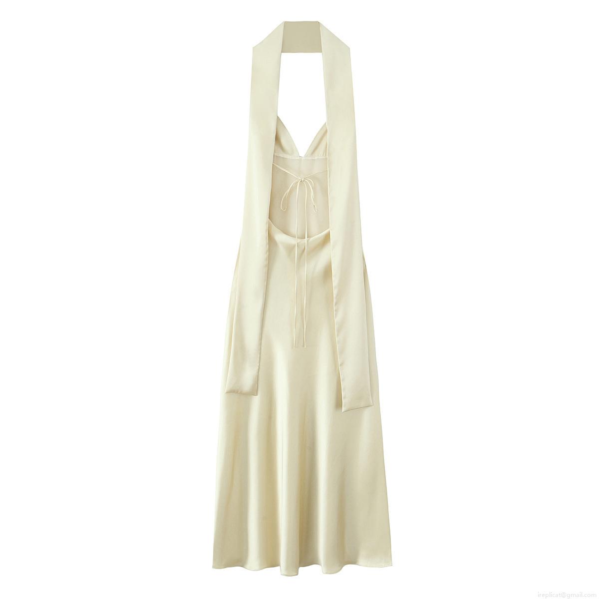 Elegant Women Satin Halter Maxi Dress Deep V Neck Backless Sexy Evening Party Dress Wedding Guest Vacation Long Dress Champagne Solid Color