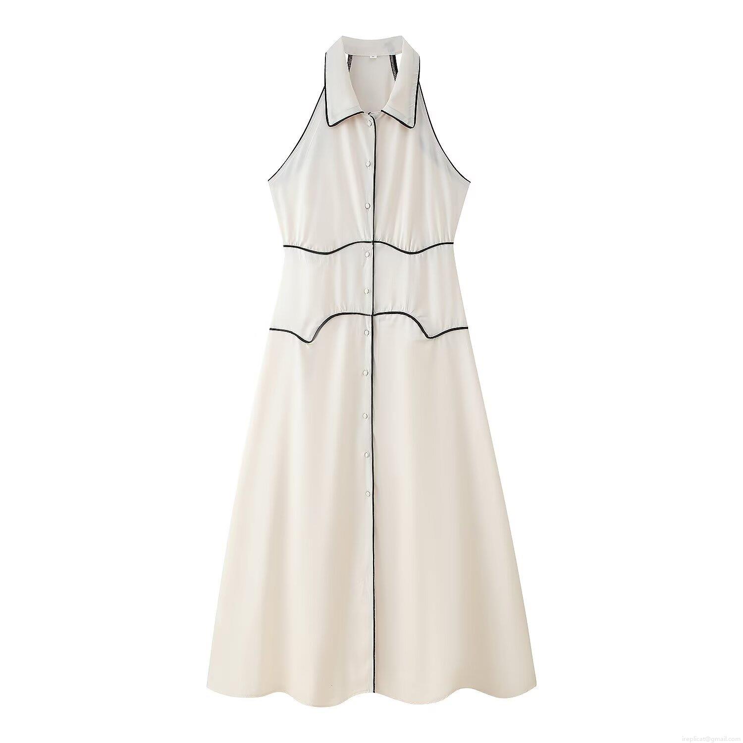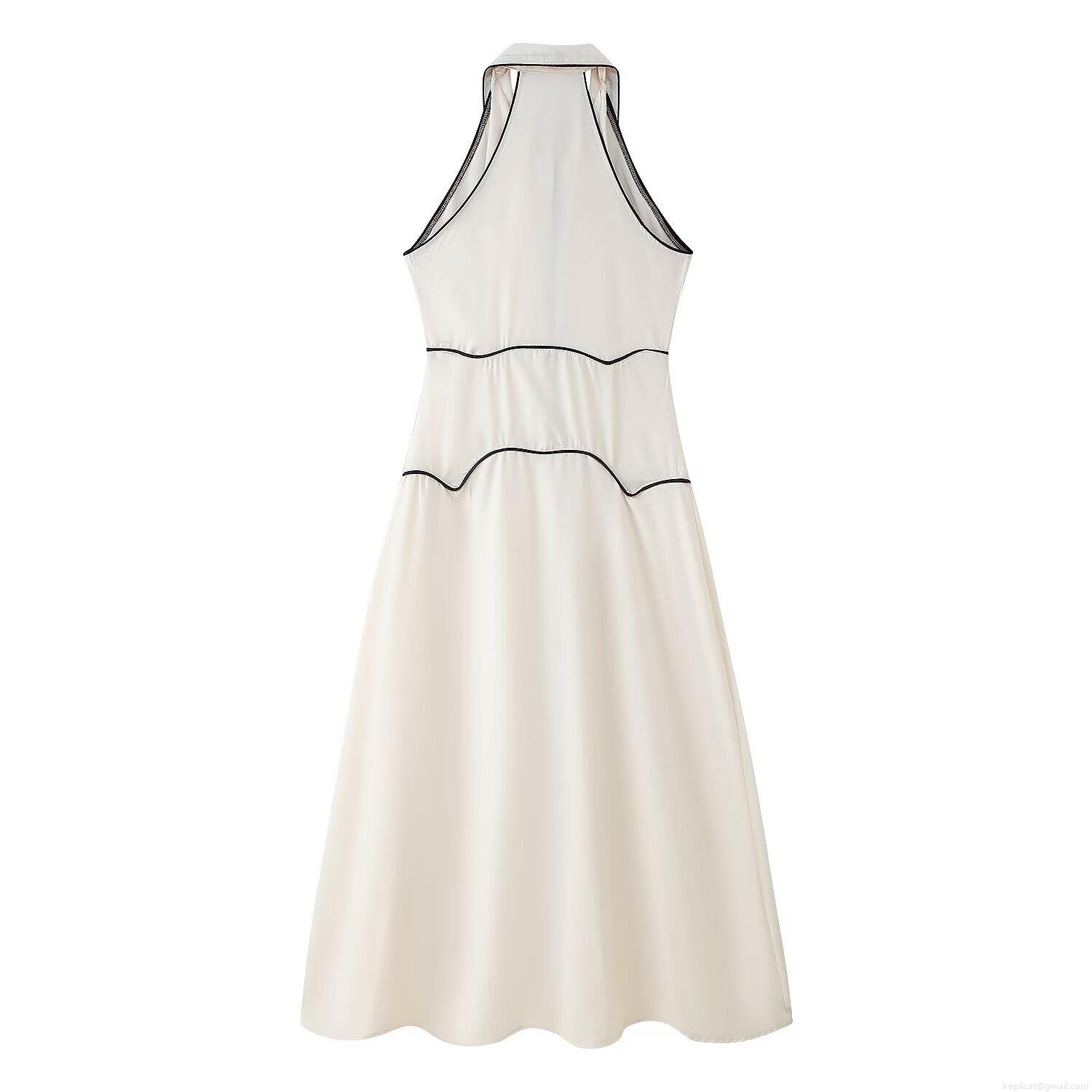 • Elegant Women Sleeveless Lapel Maxi Dress Contrast Piping Single Breasted Socialite Style Polyester Long Shirt Dress for Summer Party Vacation
