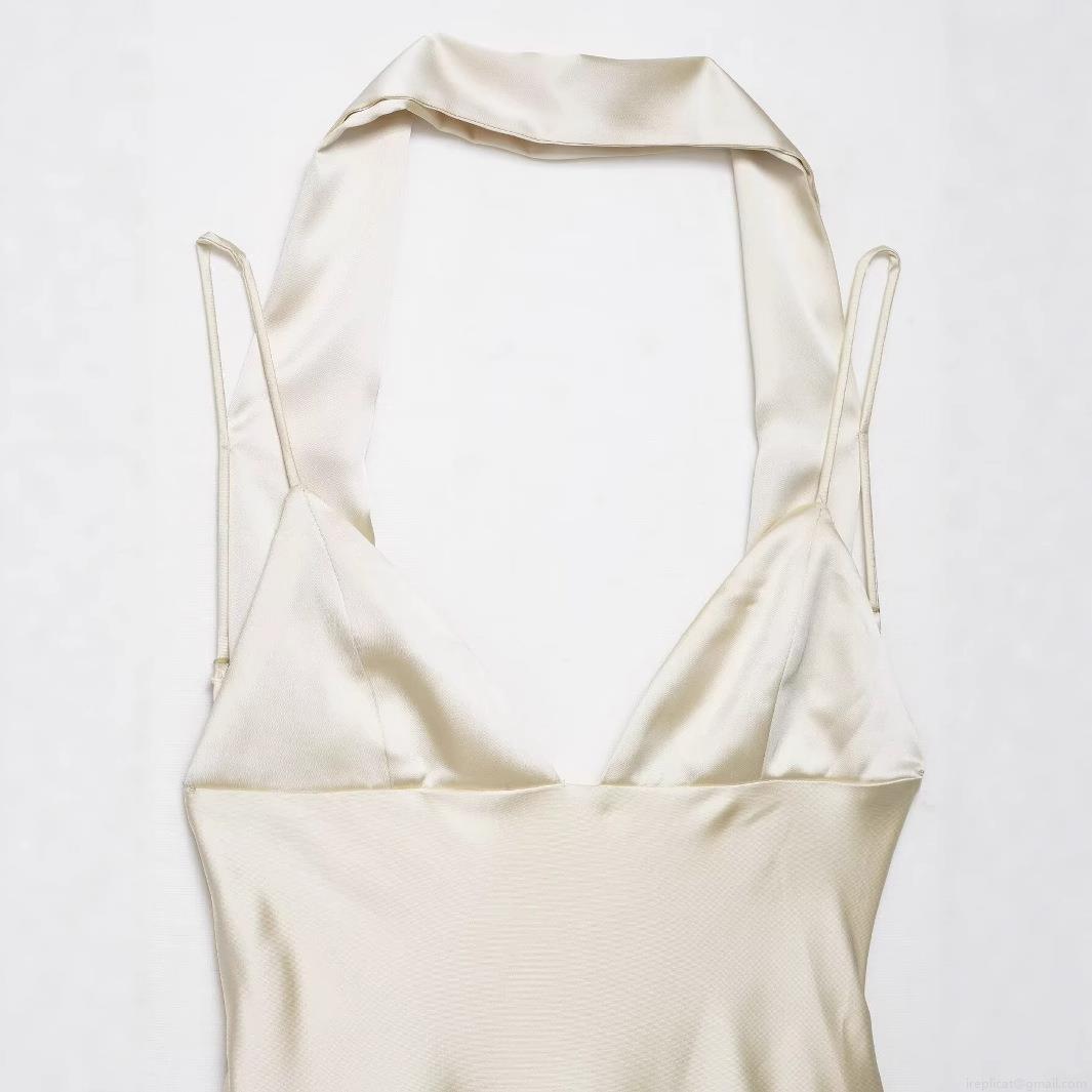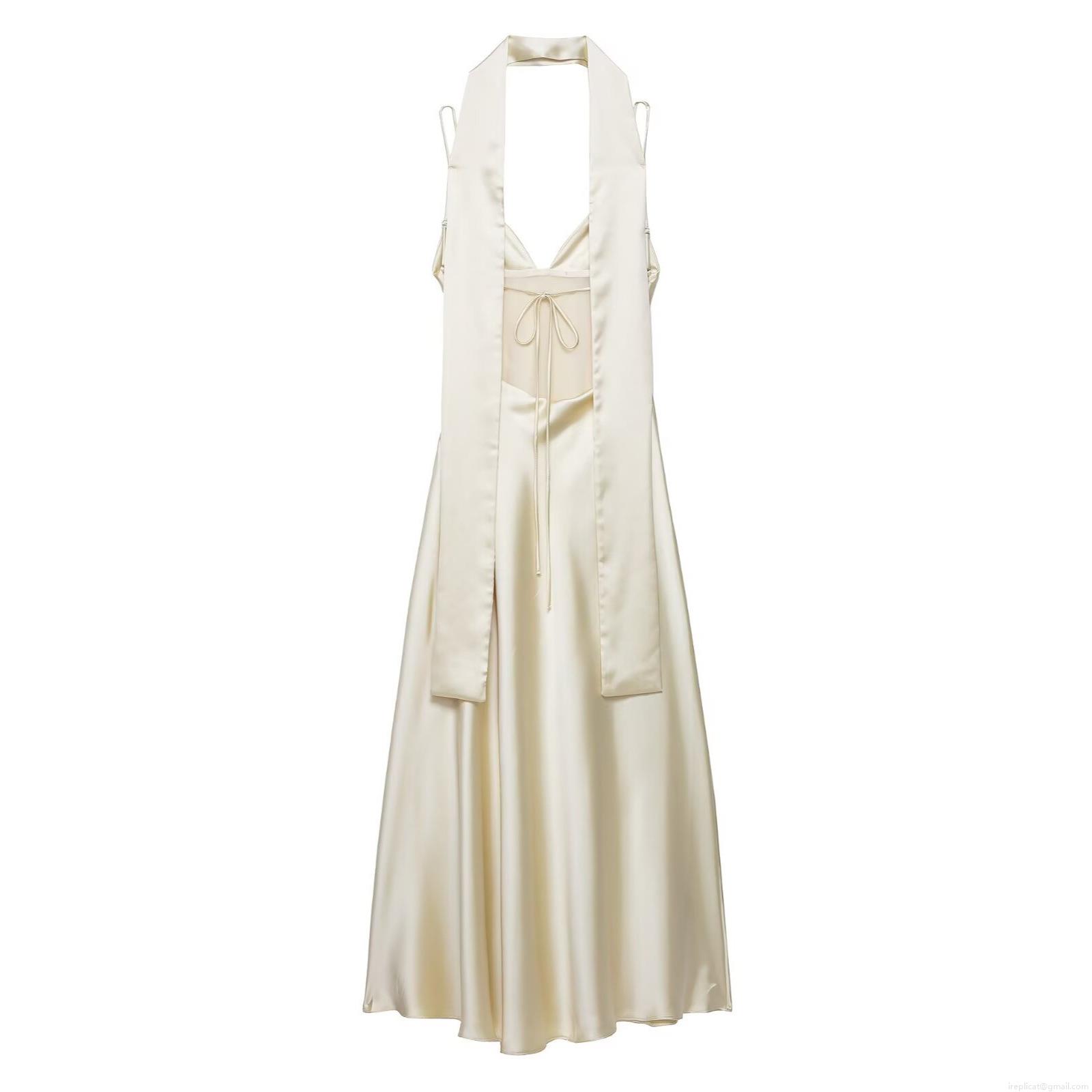 • Elegant Women's Champagne Satin Maxi Dress With Scarf Detail Halter Neck Backless V-Neck Slim Fit Sleeveless Evening Party Formal Gown Silky Texture Long Dress For Women