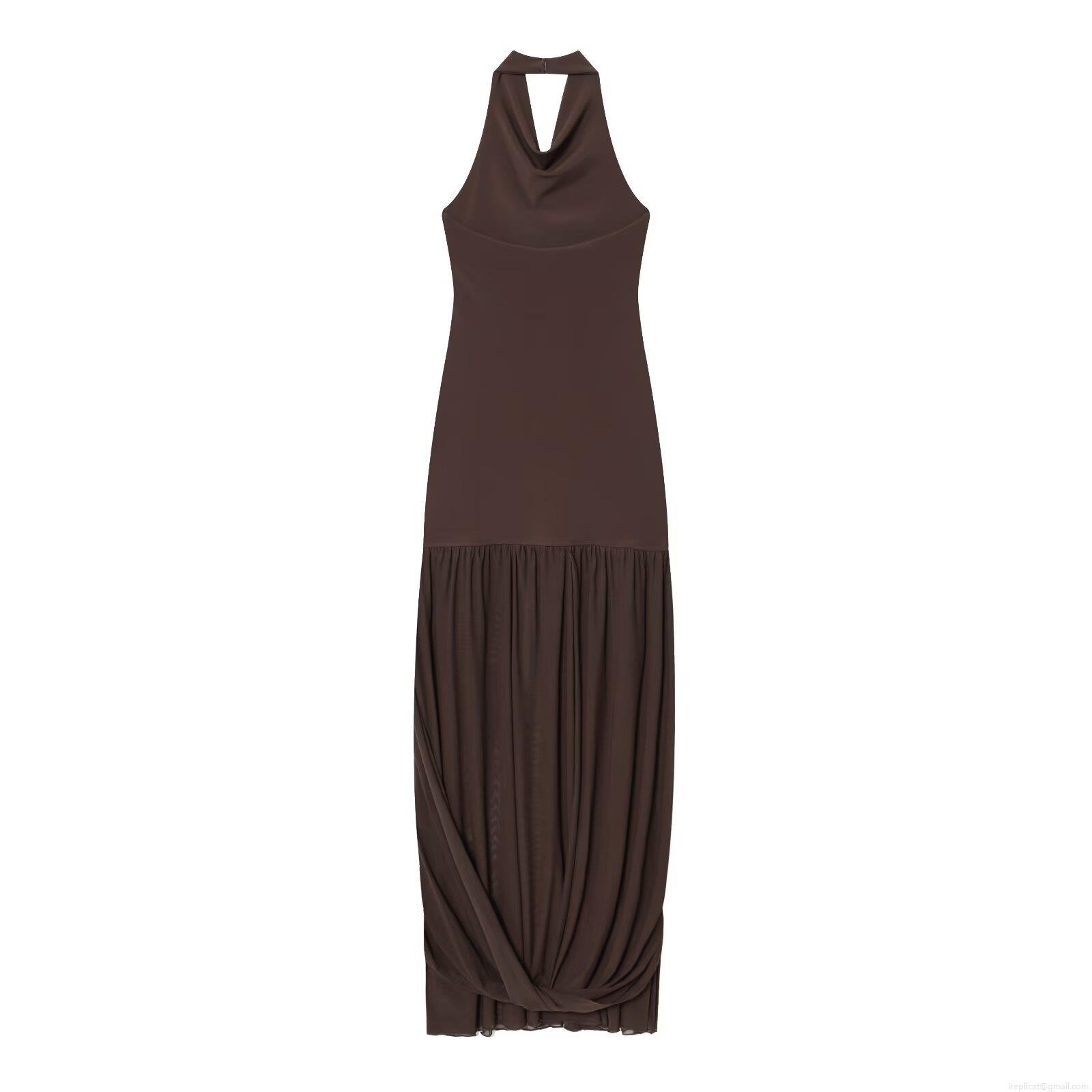 Elegant Women's Halter Neck Maxi Dress Sexy Backless Polyester Mesh Patchwork Pleated Long Dress For Party Evening Wedding Socialite Style Solid Color Coffee