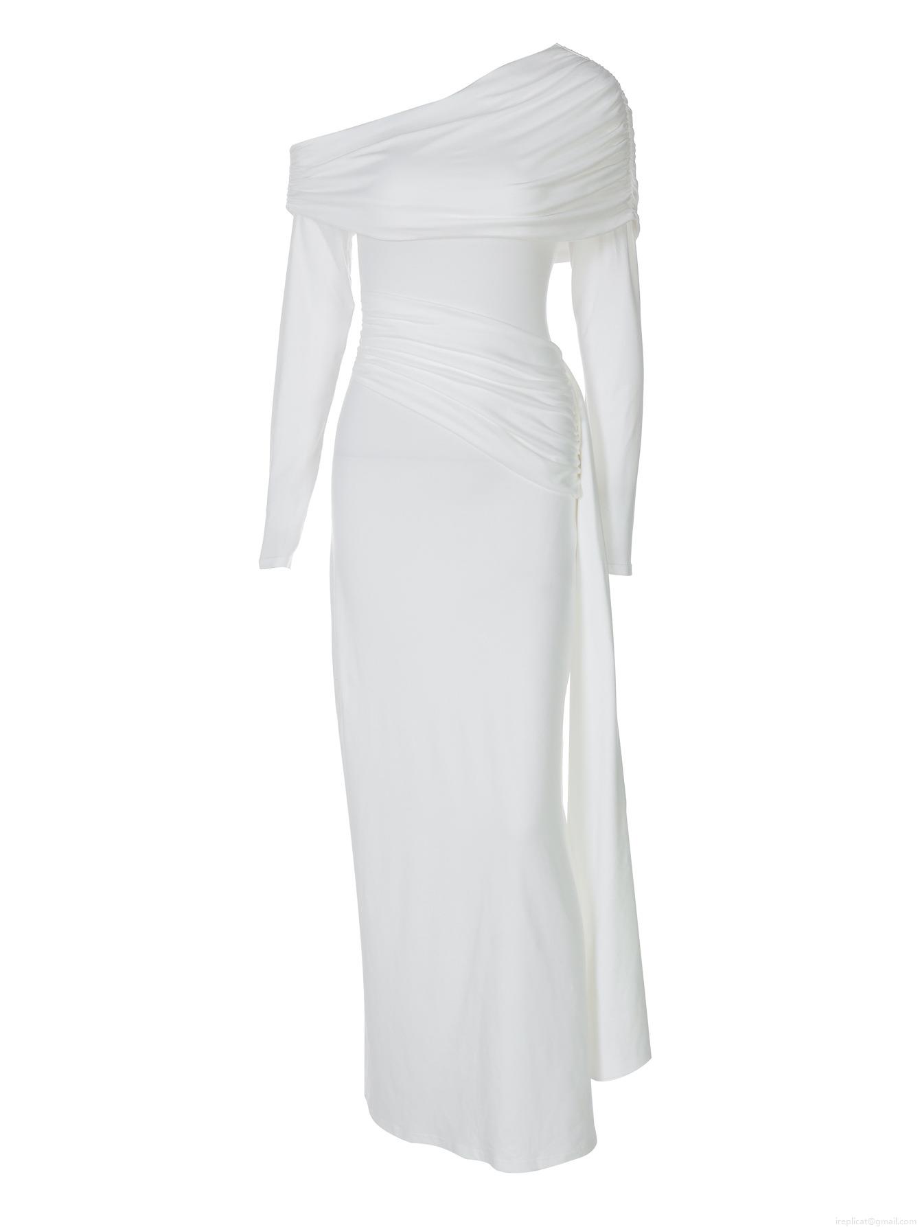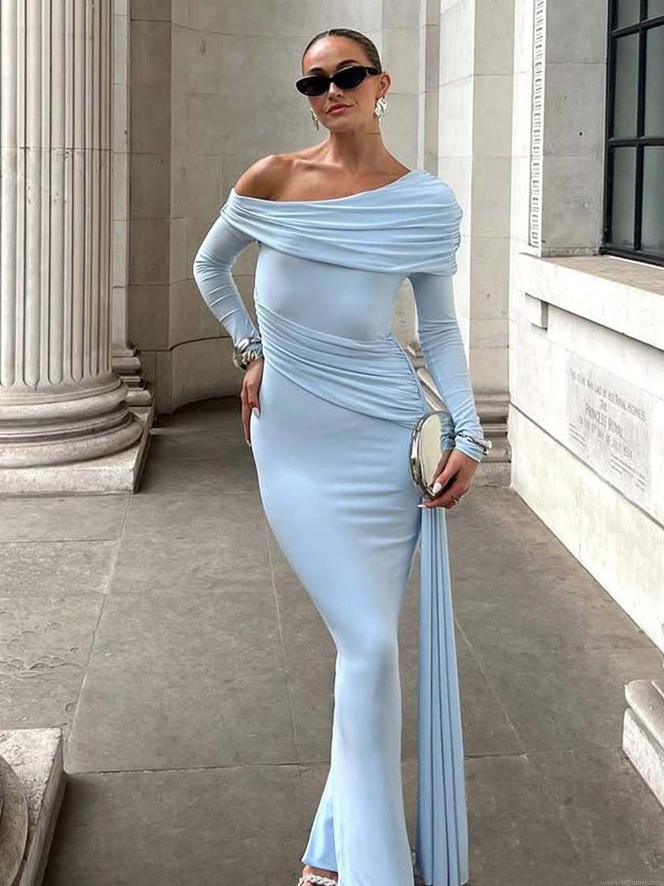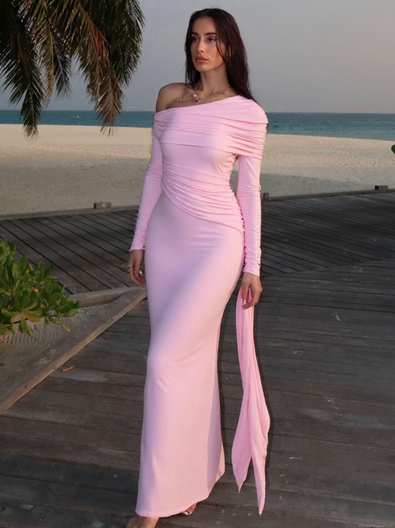 Elegant Women's One Shoulder Long Sleeve Maxi Dress Solid Color Pleated Slim Fit Bodycon Evening Party Gown With Ribbon Detail Polyester Spandex Mix