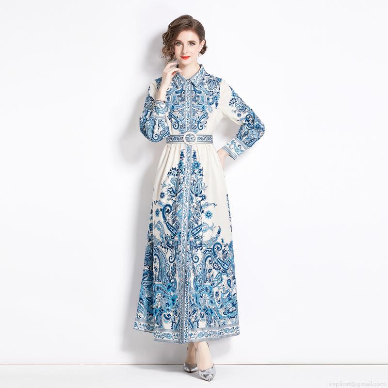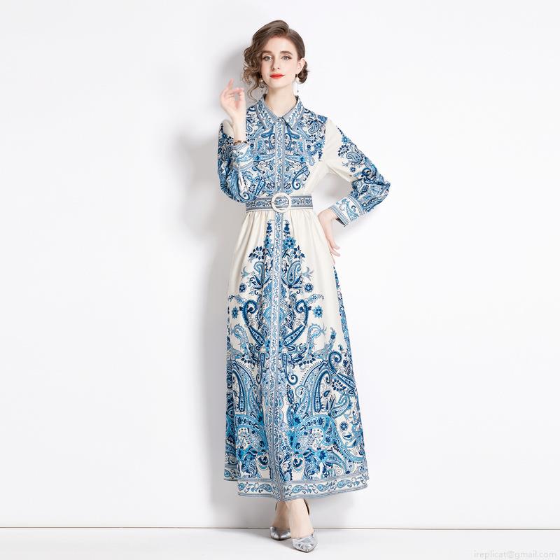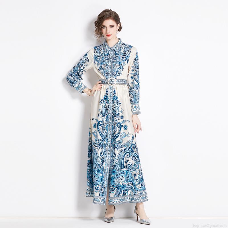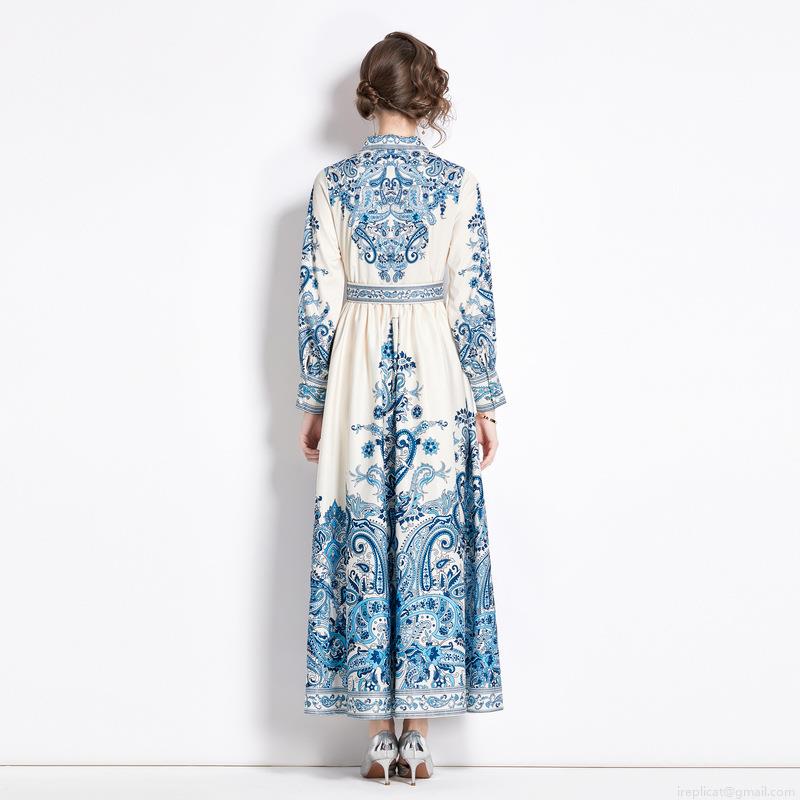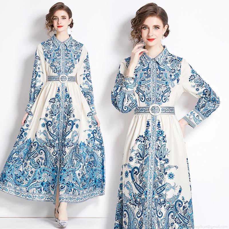 • Elegant Women's Paisley Print Maxi Dress Vintage Lapel Long Sleeve Chiffon Single Breasted Belted A-Line Dress For Vacation Party Casual