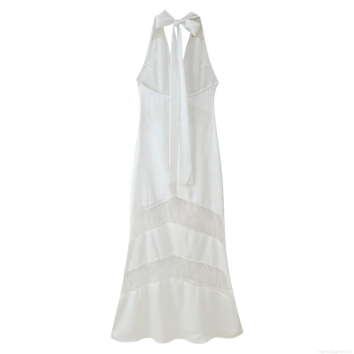 Elegant Women's Satin and Lace Patchwork Maxi Dress Halter V-Neck Backless Sleeveless Evening Party Wedding Guest Long Dress With Bow
