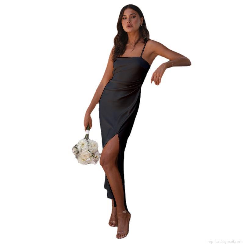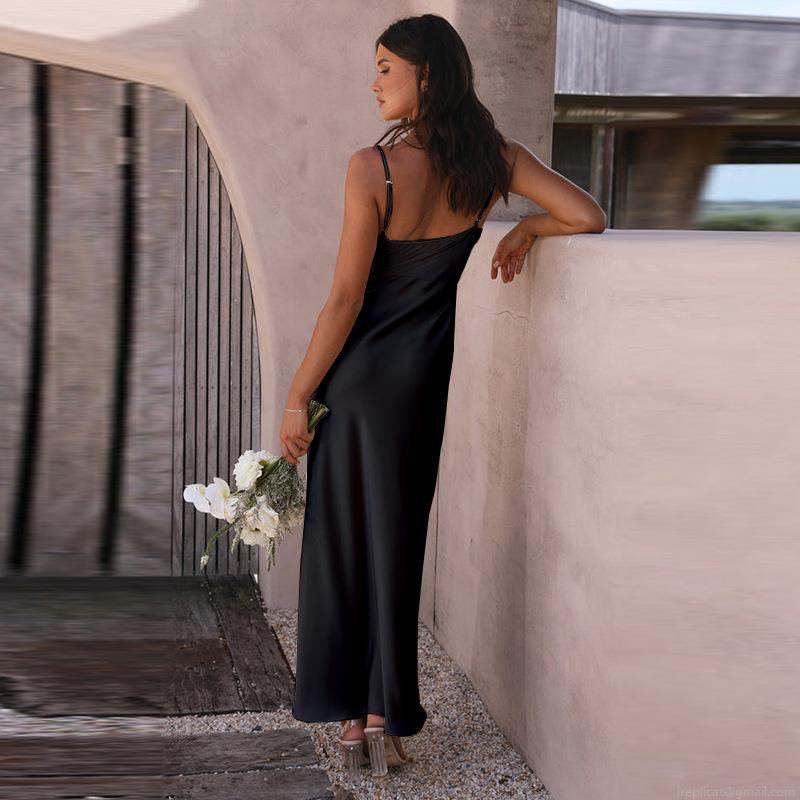 • Elegant Women's Satin Cami Maxi Dress Sexy Backless High Slit Evening Gown For Wedding Party Vacation Summer Solid Color Silk-Like Long Dress