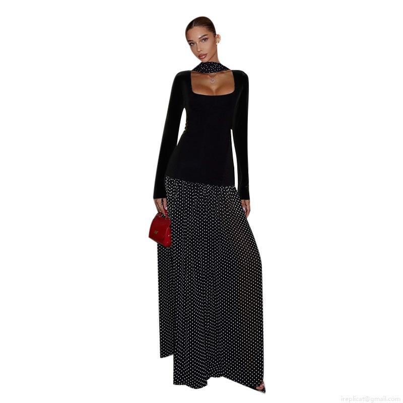 • Elegant Women's Velvet Patchwork Polka Dot Maxi Dress Square Neck Long Sleeve A-Line Evening Party Floor Length Dress Vintage French Style