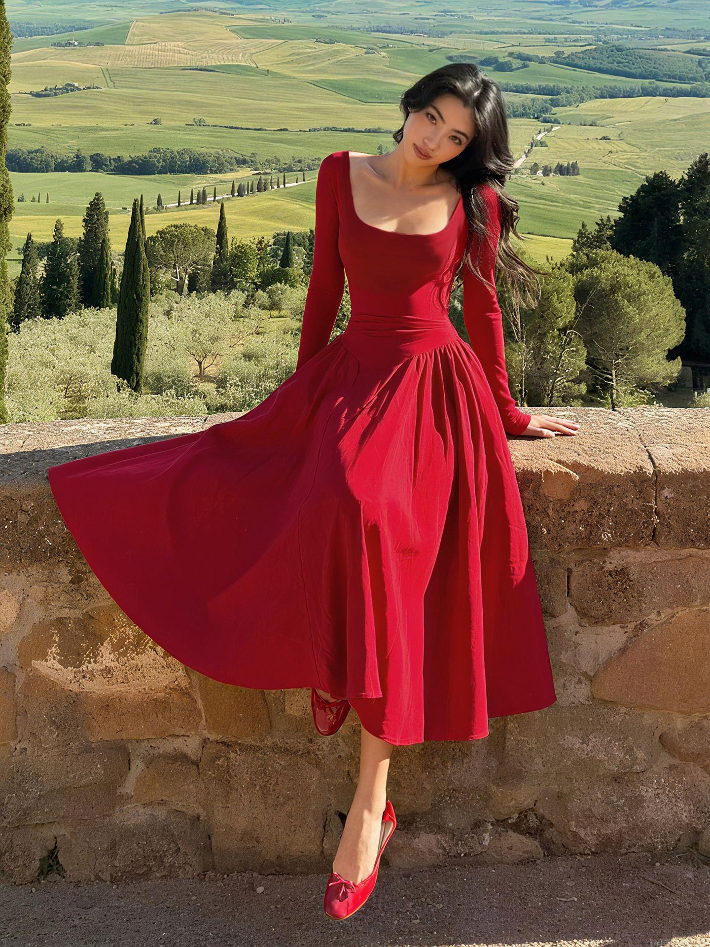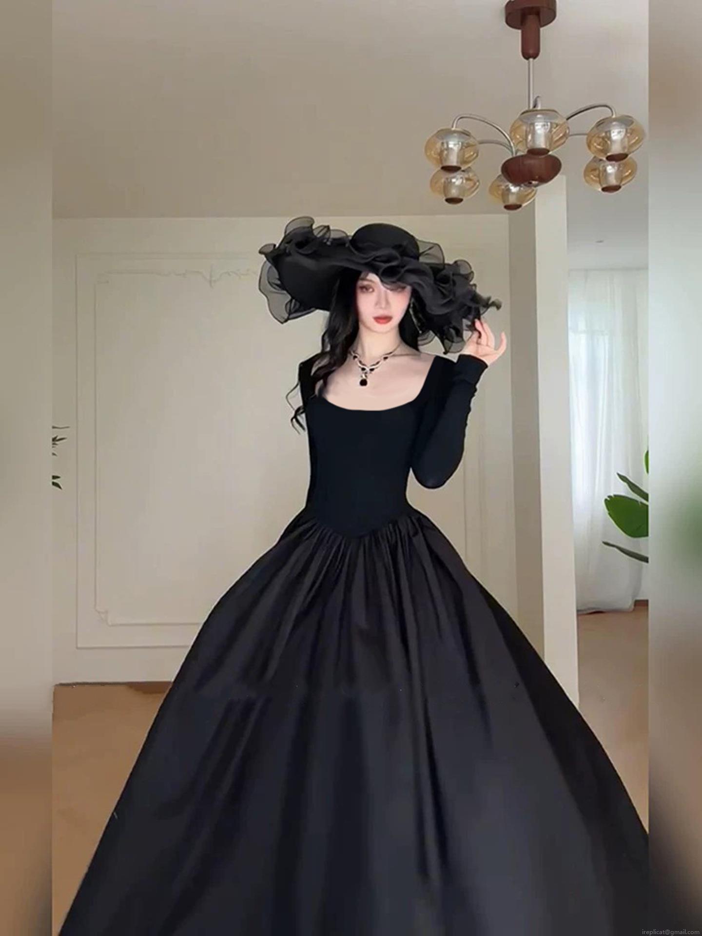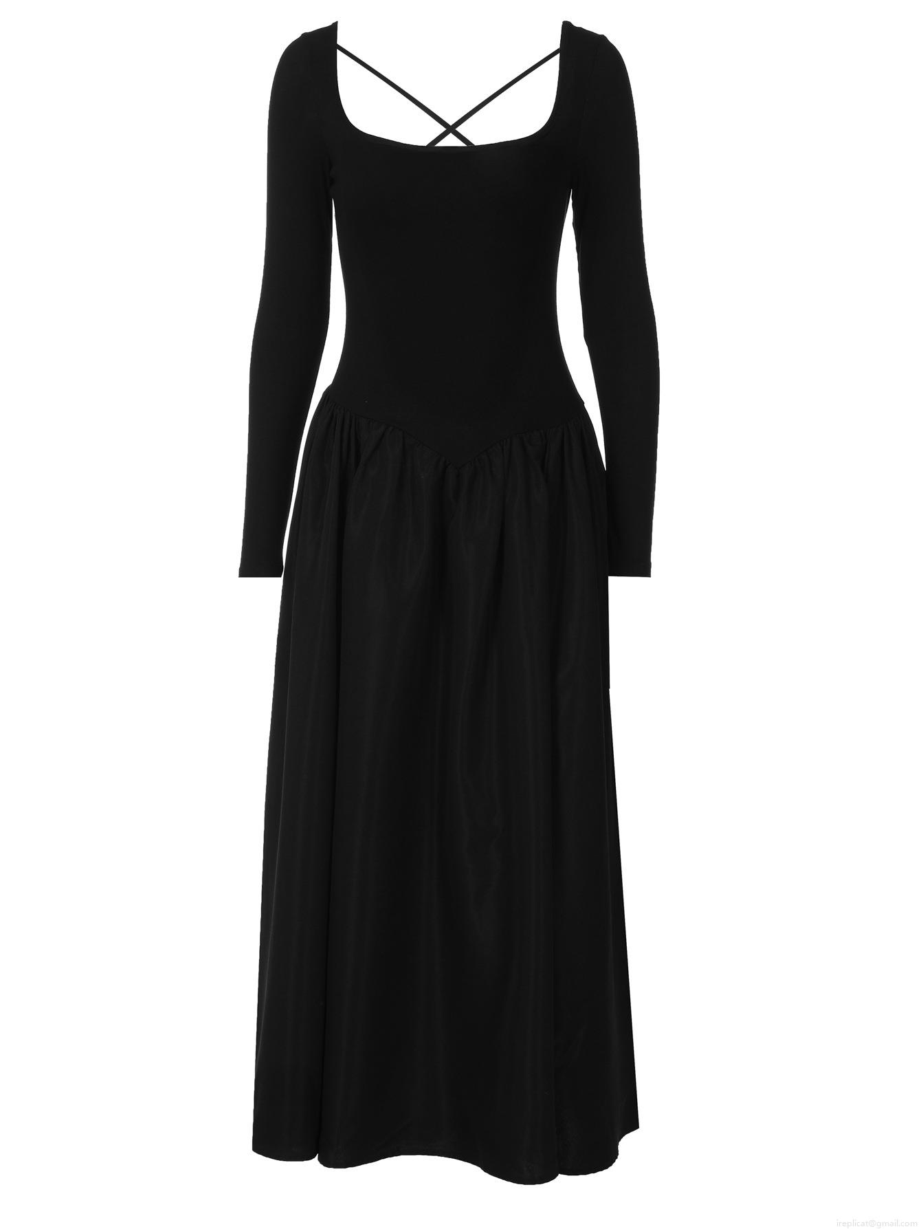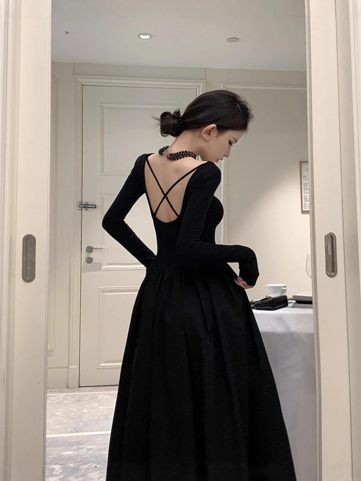 French Audrey Hepburn Style Long Sleeve Dress Elegant Polyester Square Neck Backless Cross Tie Slim Fit Maxi Dress For Women Party Dating Evening