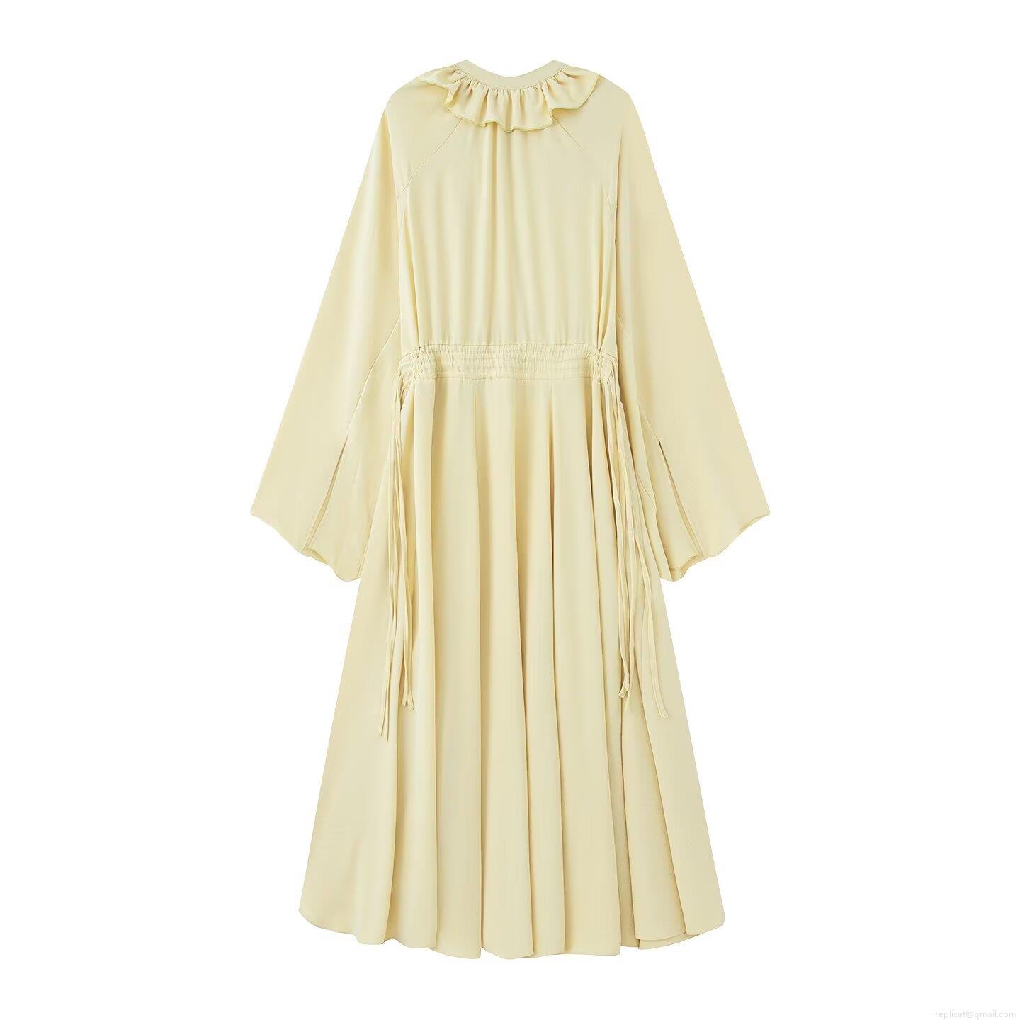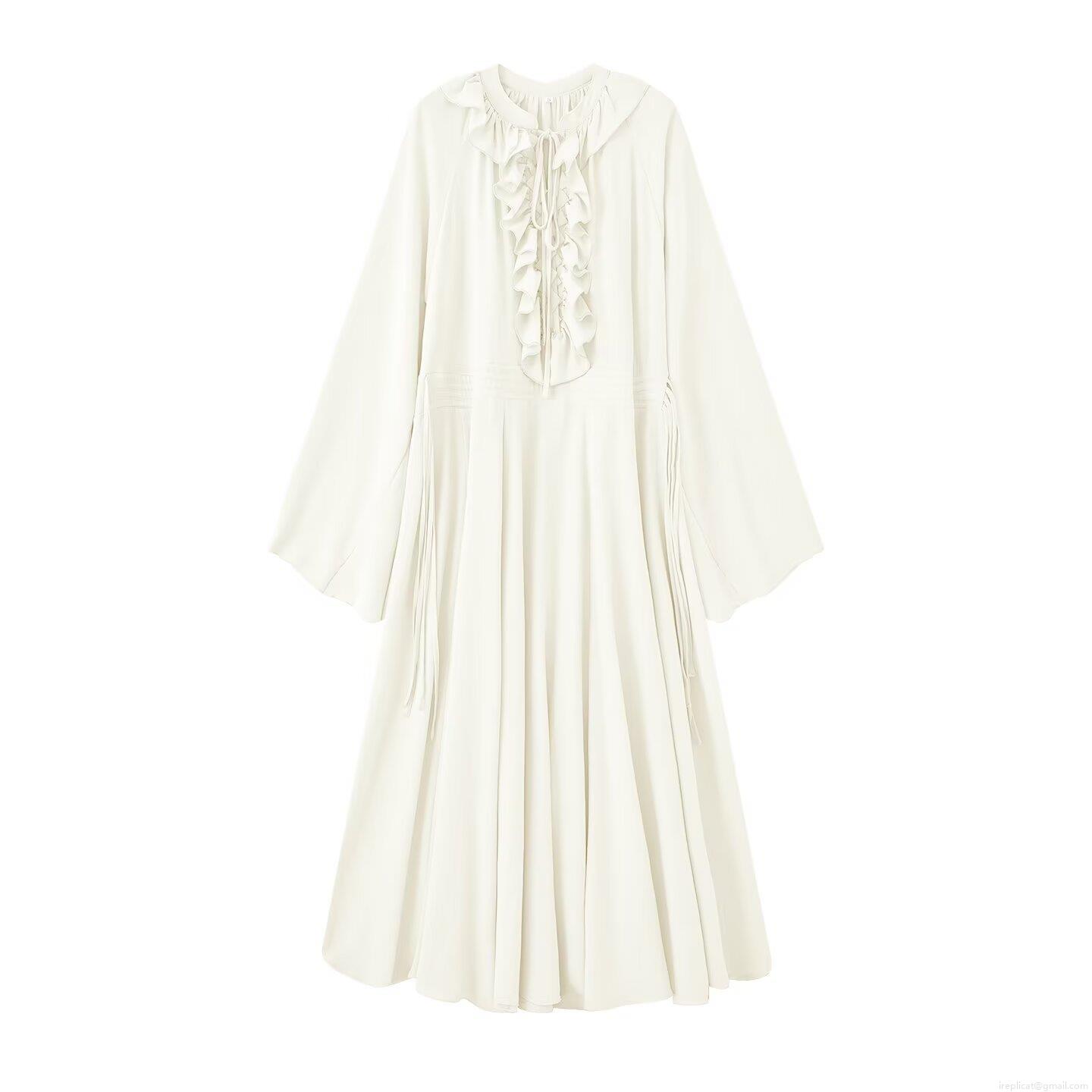 • French Boho Maxi Dress Ruffle Stand Collar Long Sleeve Lace-up Waist Elegant Loose Pleated Polyester Women's Casual Party Socialite Solid Color Dress