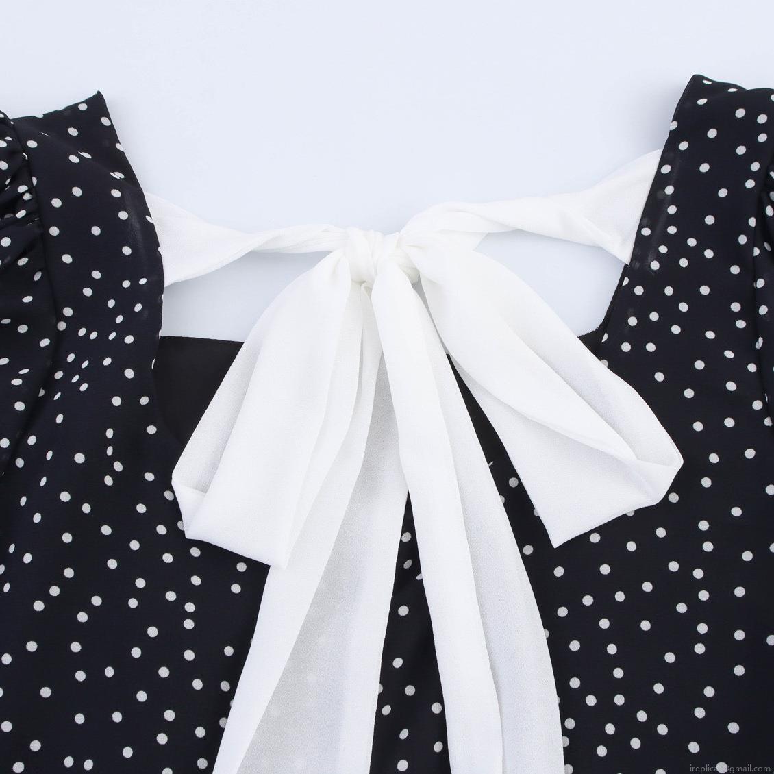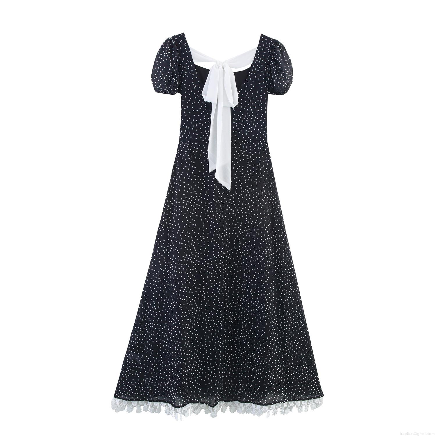 French Elegant Polka Dot Maxi Dress With Back Bow And Puff Sleeve Square Neck Lace Trim Slim Fit Retro Long Dress For Women