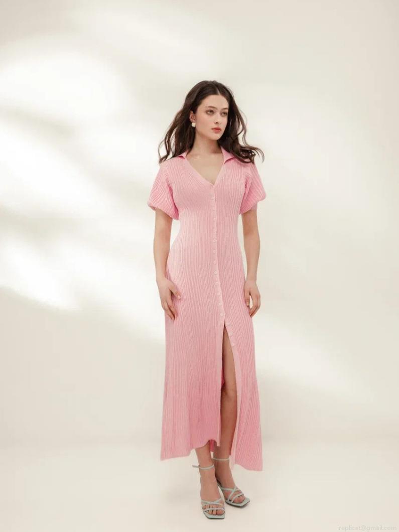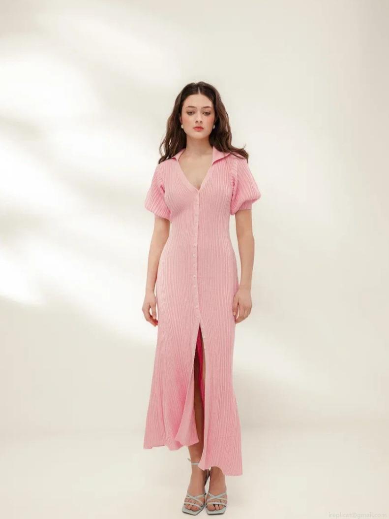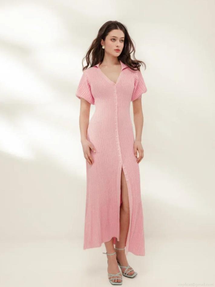 • French Elegant Vintage Knit Maxi Dress Women Short Puff Sleeve V-Neck Single Breasted Side Slit Slim Fit Polyester Acrylic Blend Summer Vacation Dress