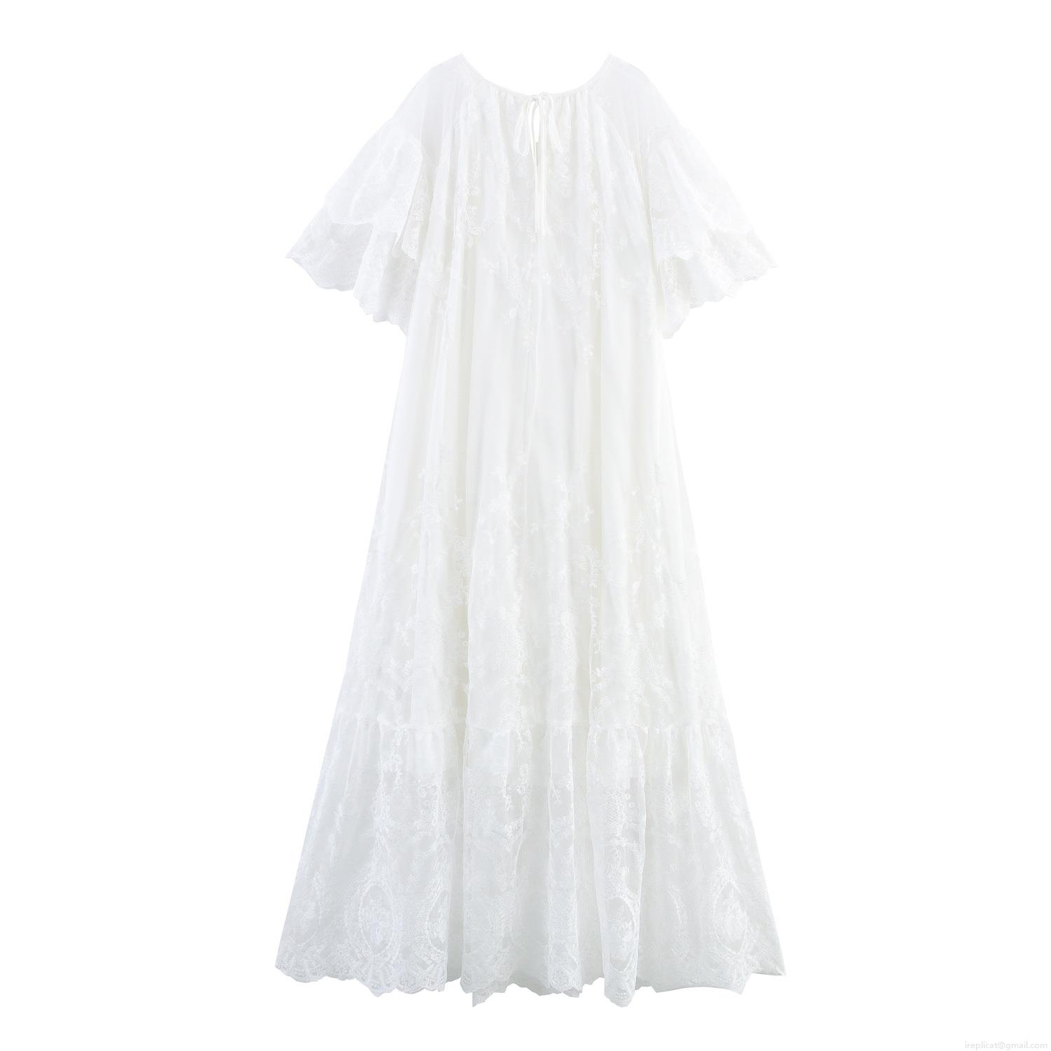 • French Elegant White Lace Maxi Dress Vintage Round Neck Embroidery Long Sleeve Loose Dress For Women Party Dating Daily