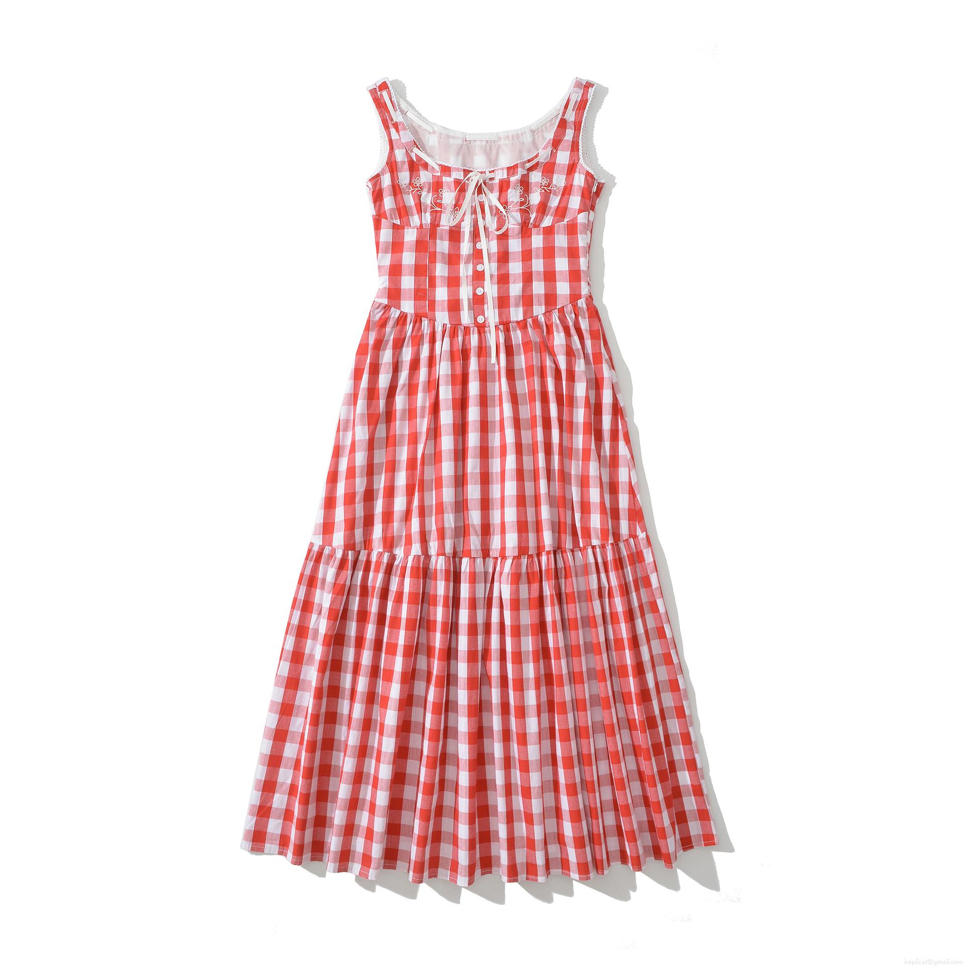 • French Retro Red Gingham Maxi Dress Women Sweet Floral Embroidery Square Neck Bow Cami Tiered Cake Skirt For Beach Vacation Resort Party Elegant Cotton Blend Dress