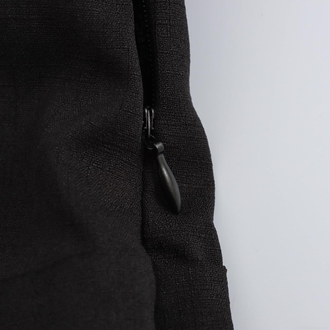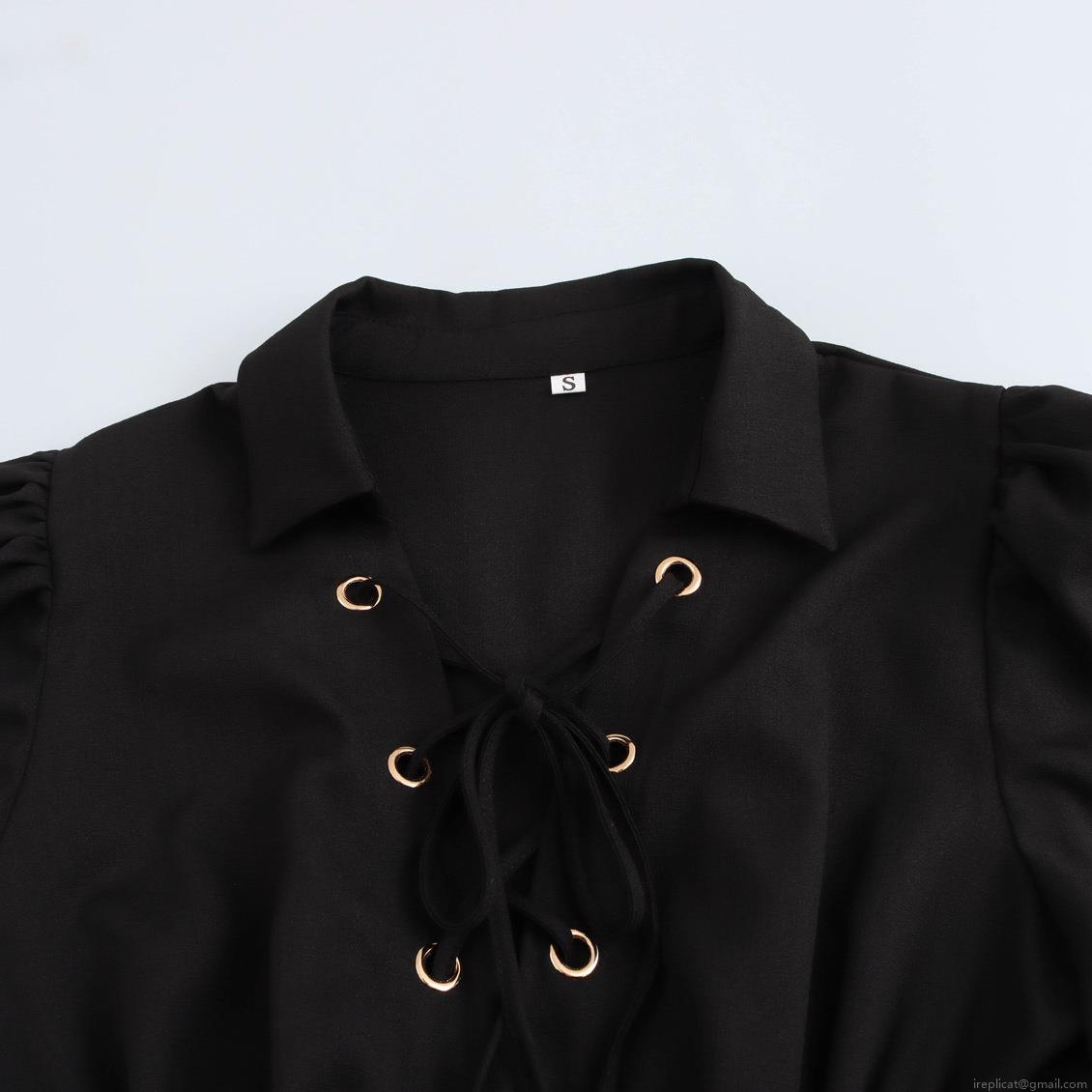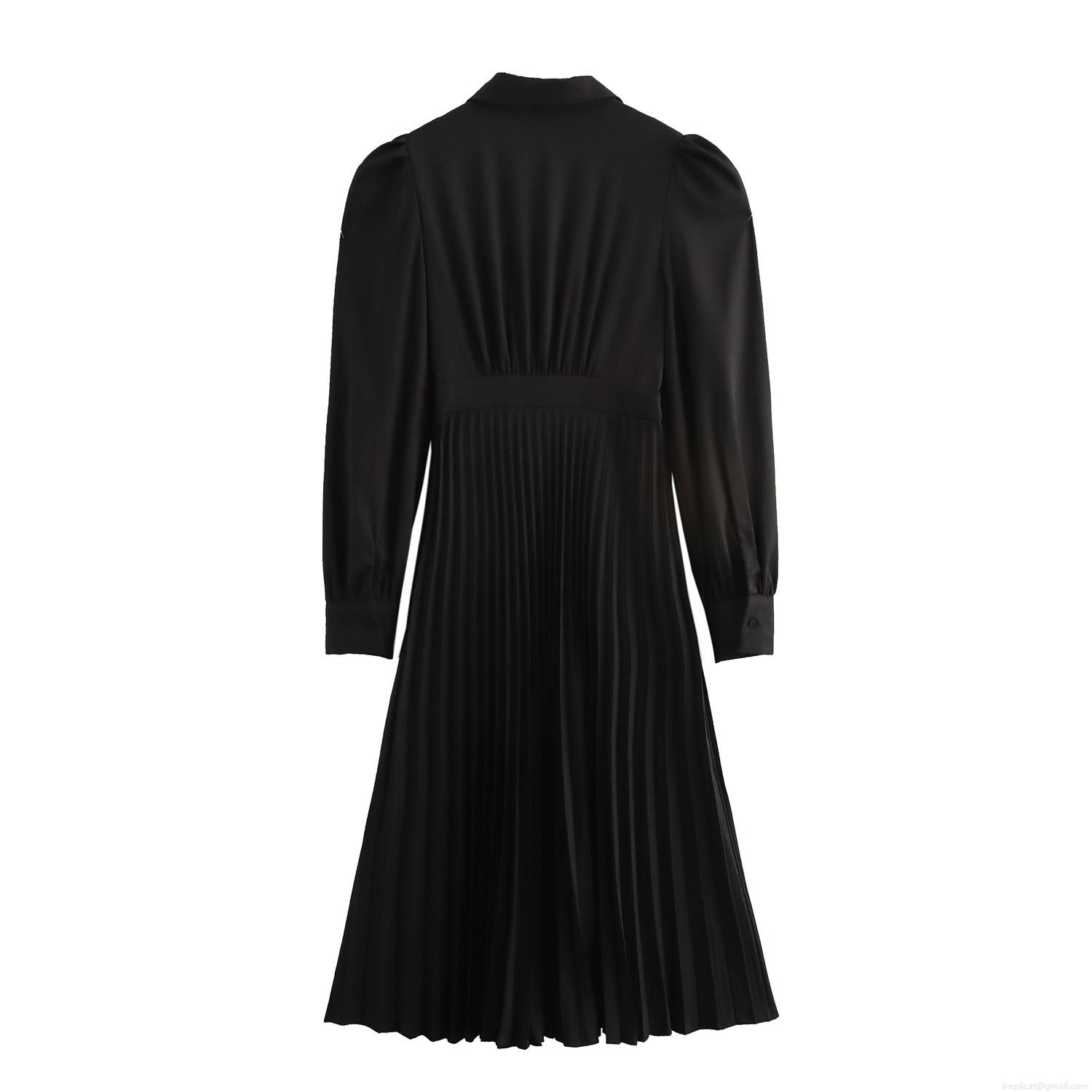 • French Style Black Pleated Maxi Dress For Women Elegant Lace Up Front Polo Collar Puff Sleeve Solid Color Polyester Dress For Party Dating