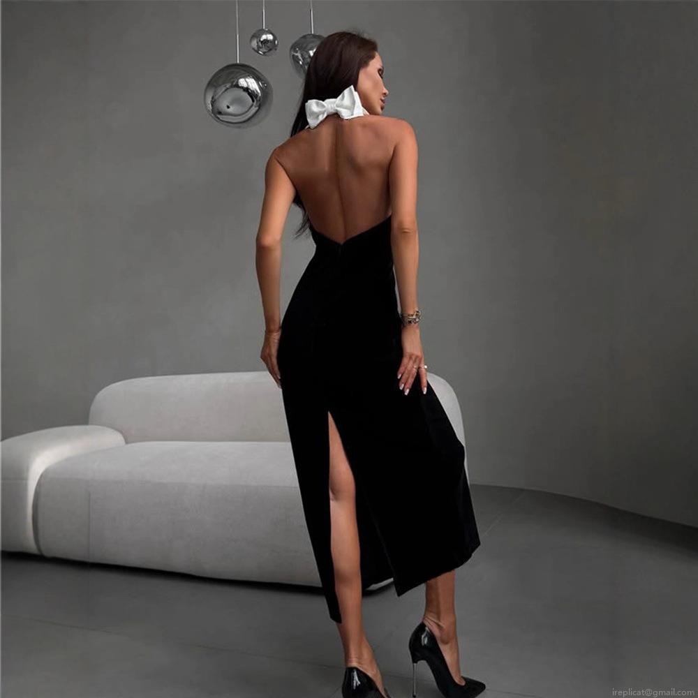 • French Style Contrast Color Halter Backless Maxi Dress Slim Fit White Collar Button Decor Elegant Evening Party Dresses For Women