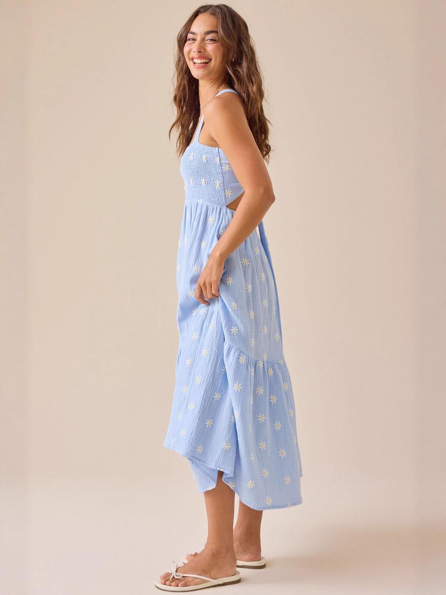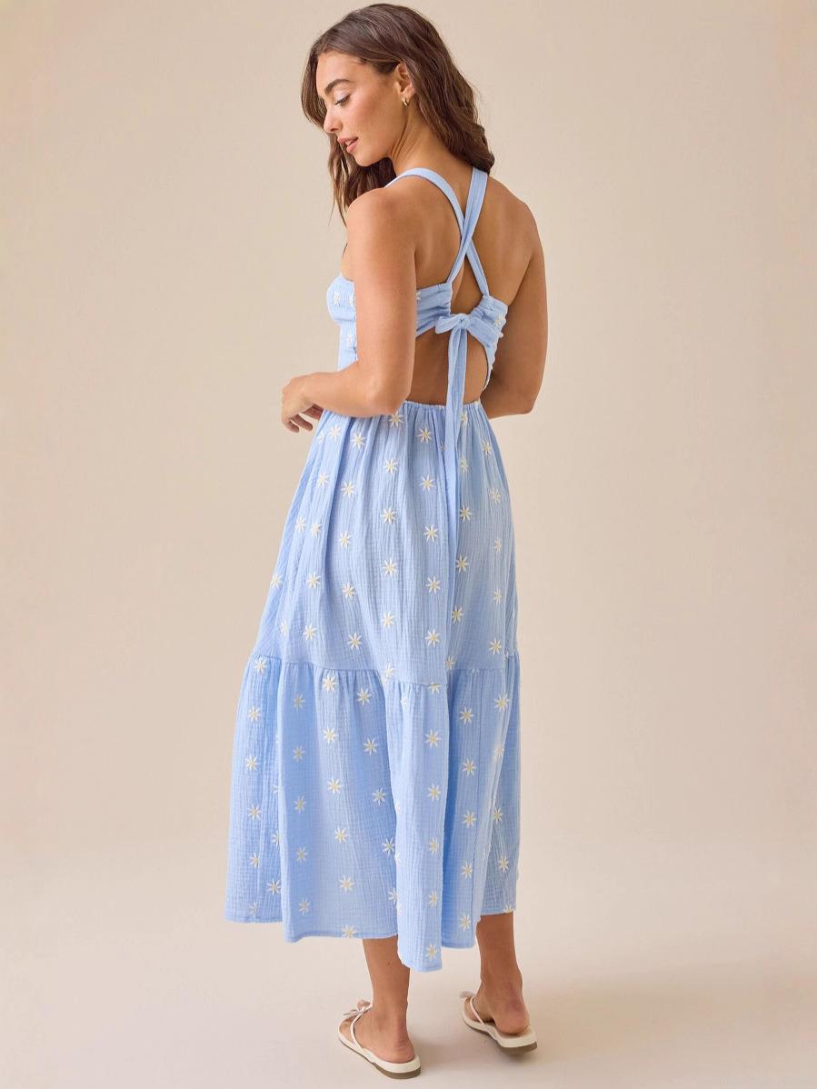 • French Style Daisy Embroidered Cami Maxi Dress For Women Summer Beach Vacation Smocked Bust Lace-up Back Boho Tiered Sun Dress