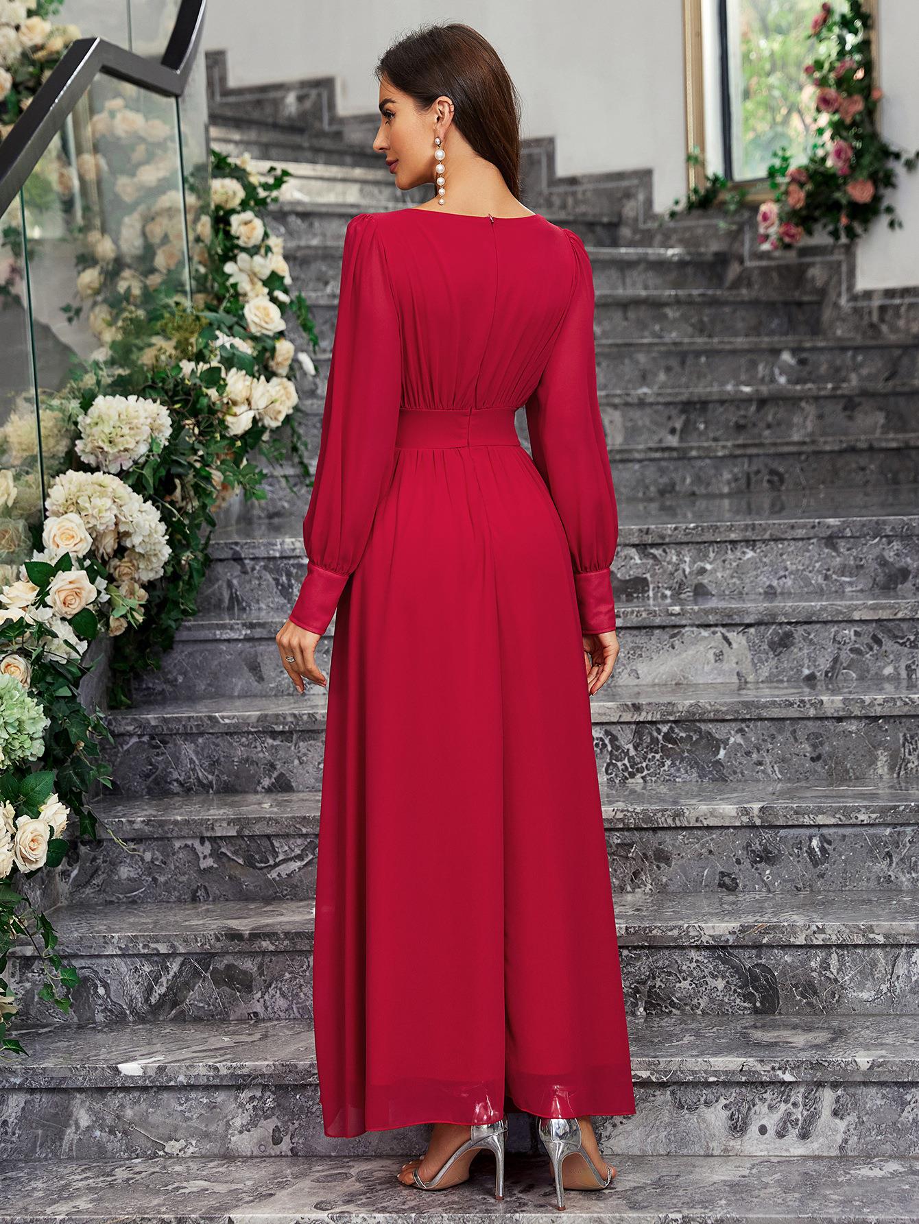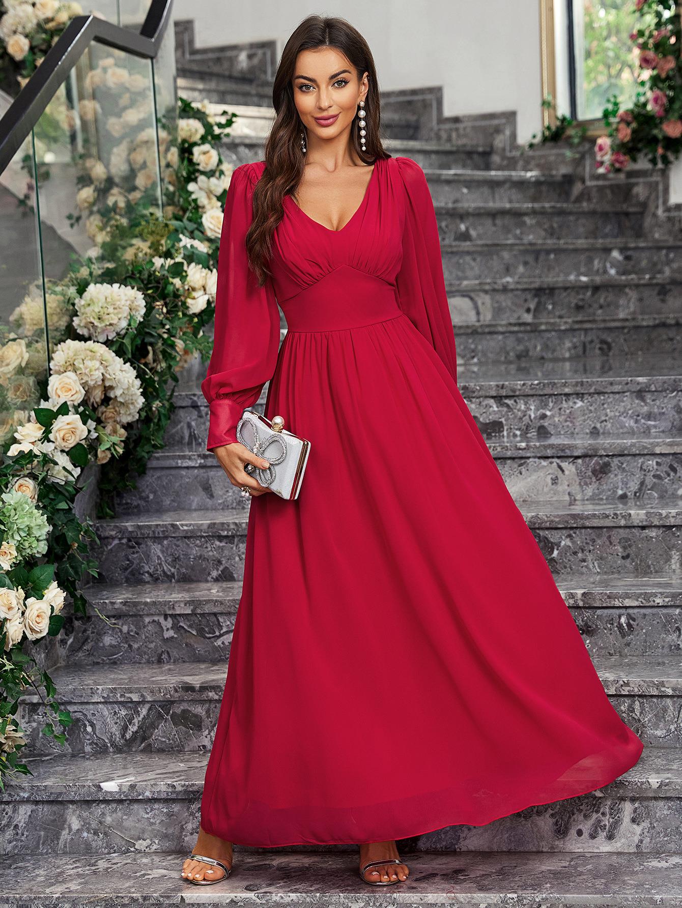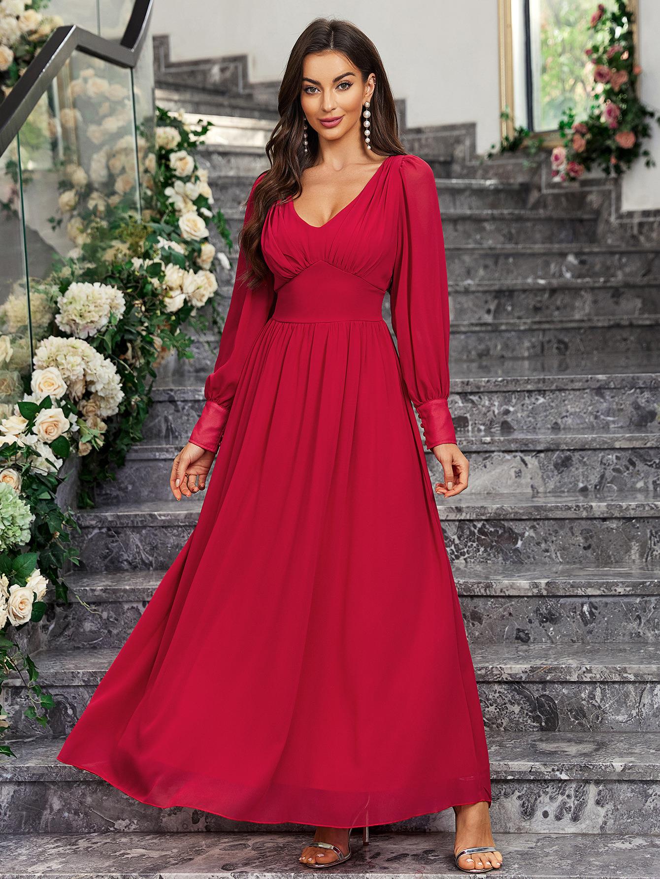 • French Style Elegant V-Neck Long Sleeve Chiffon Maxi Dress High Waist Ruffle Stitched A-Line Evening Long Dress for Women