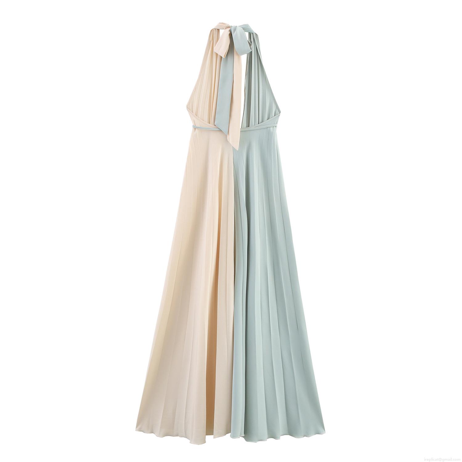 French Style Halter Pleated Maxi Dress Contrast Color Backless A-Line Waist Tie Polyester Splicing Dress For Women Summer Party Wedding Vacation