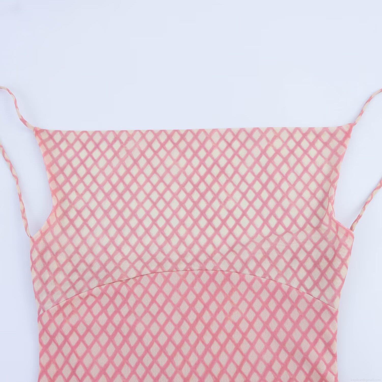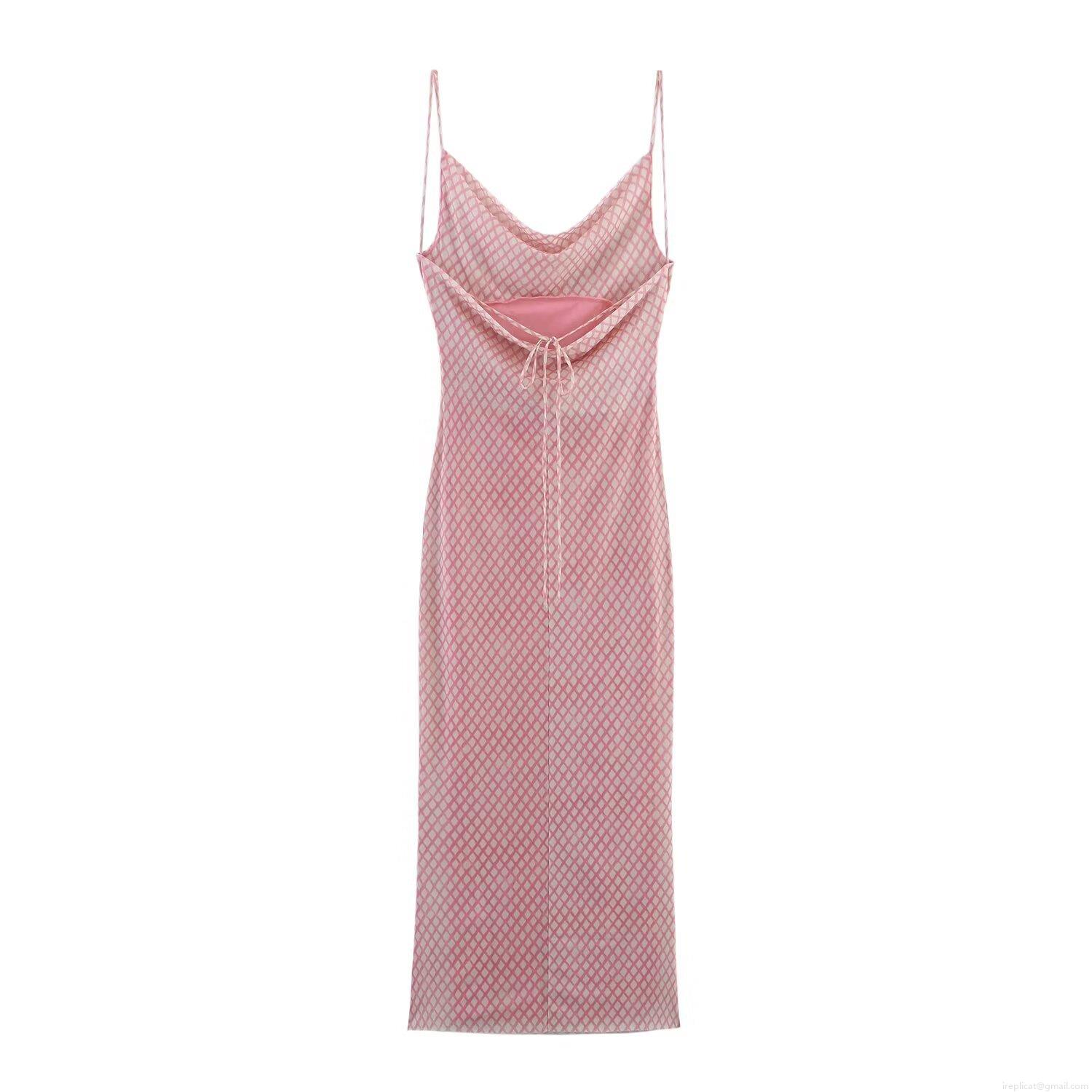 • French Style Pink Harlequin Check Mesh Maxi Dress Women Sexy Backless Cowl Neck Spaghetti Strap Party Evening Elegant Long Dress