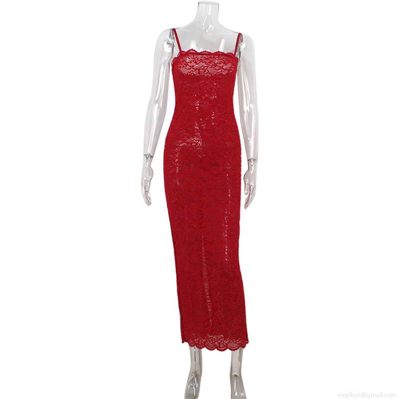 • French Style Red Floral Lace Strap Maxi Dress Slim Fit Back Split Bodycon Spandex Evening Party Dress For Women Sexy Elegant Clubwear