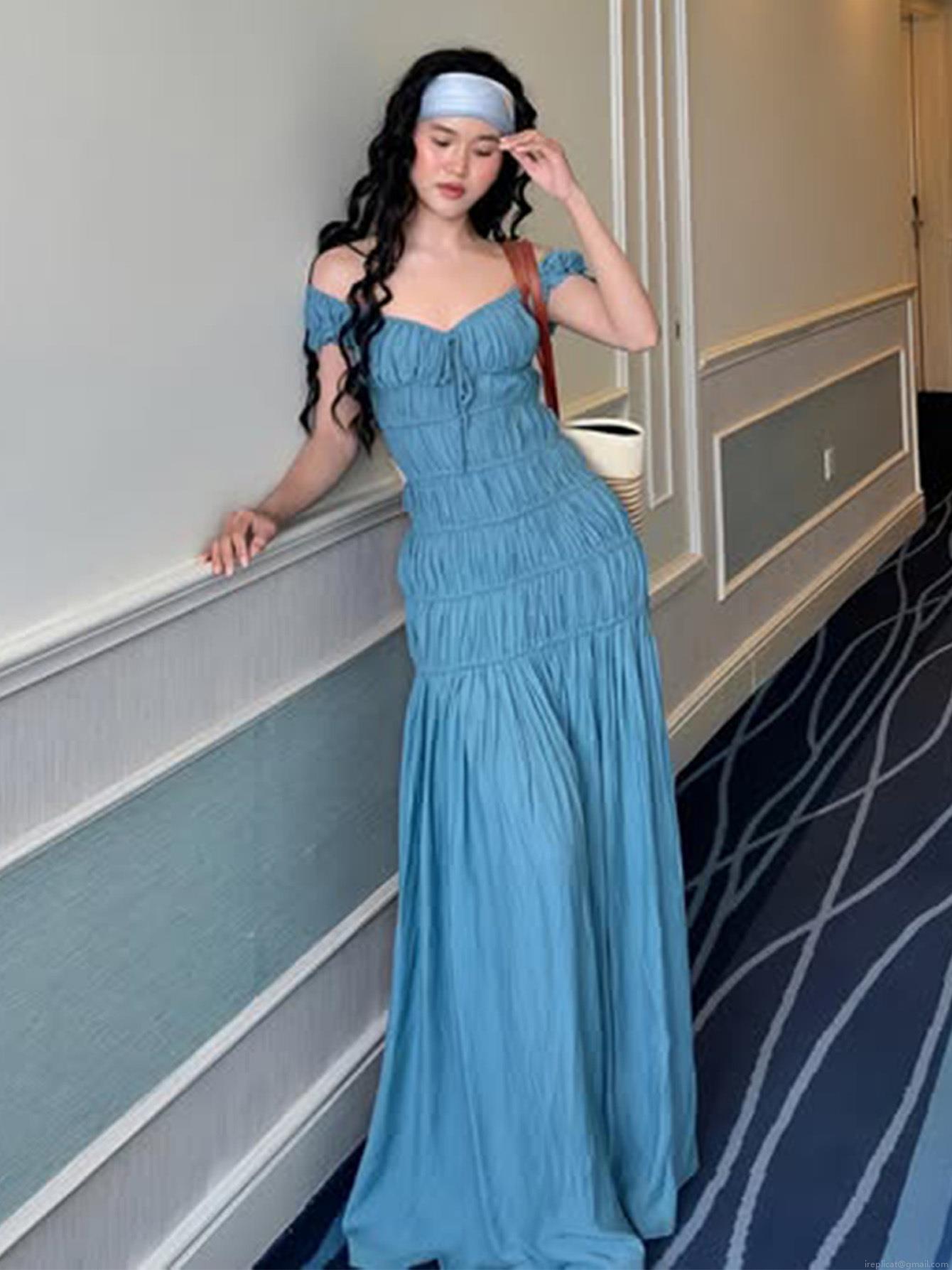 • French Style Women Sexy V Neck Smocked Maxi Dress Ruffle Sleeve Ruched Slim Fit Viscose Polyester Blend Summer Vacation Party Long Dress