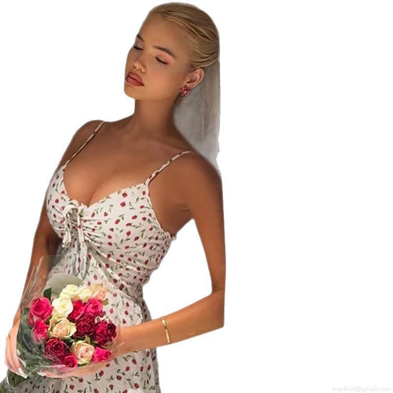 French Sweet Floral Suspender Maxi Dress Women High Waist Lace Up Summer Sleeveless Slim Fit Polyester Spandex Rose Print Long Dress For Vacation Party Dating