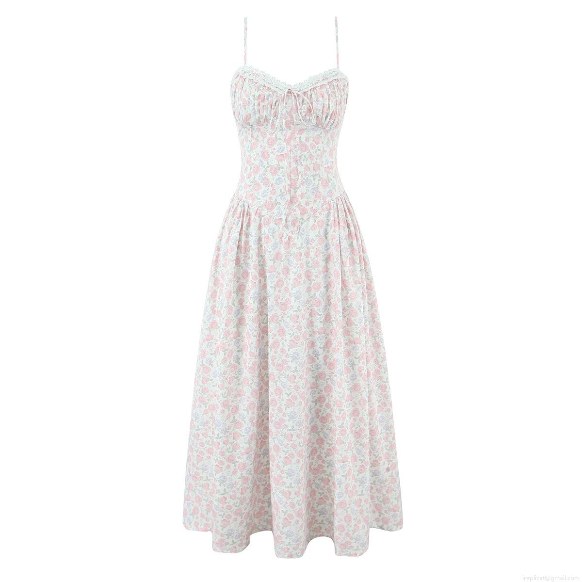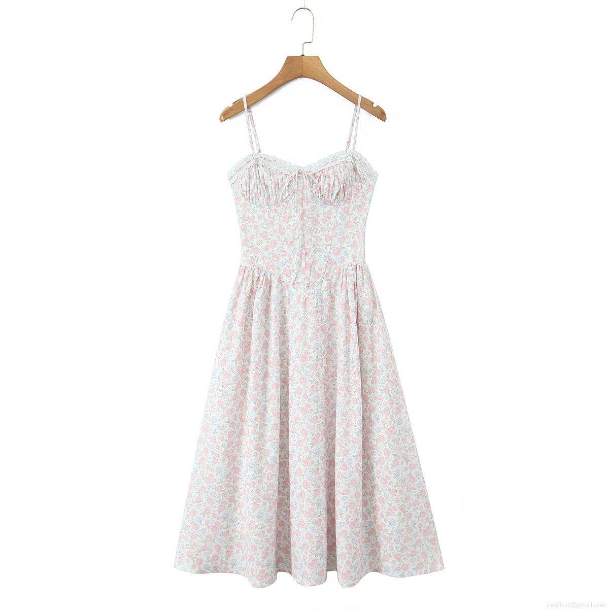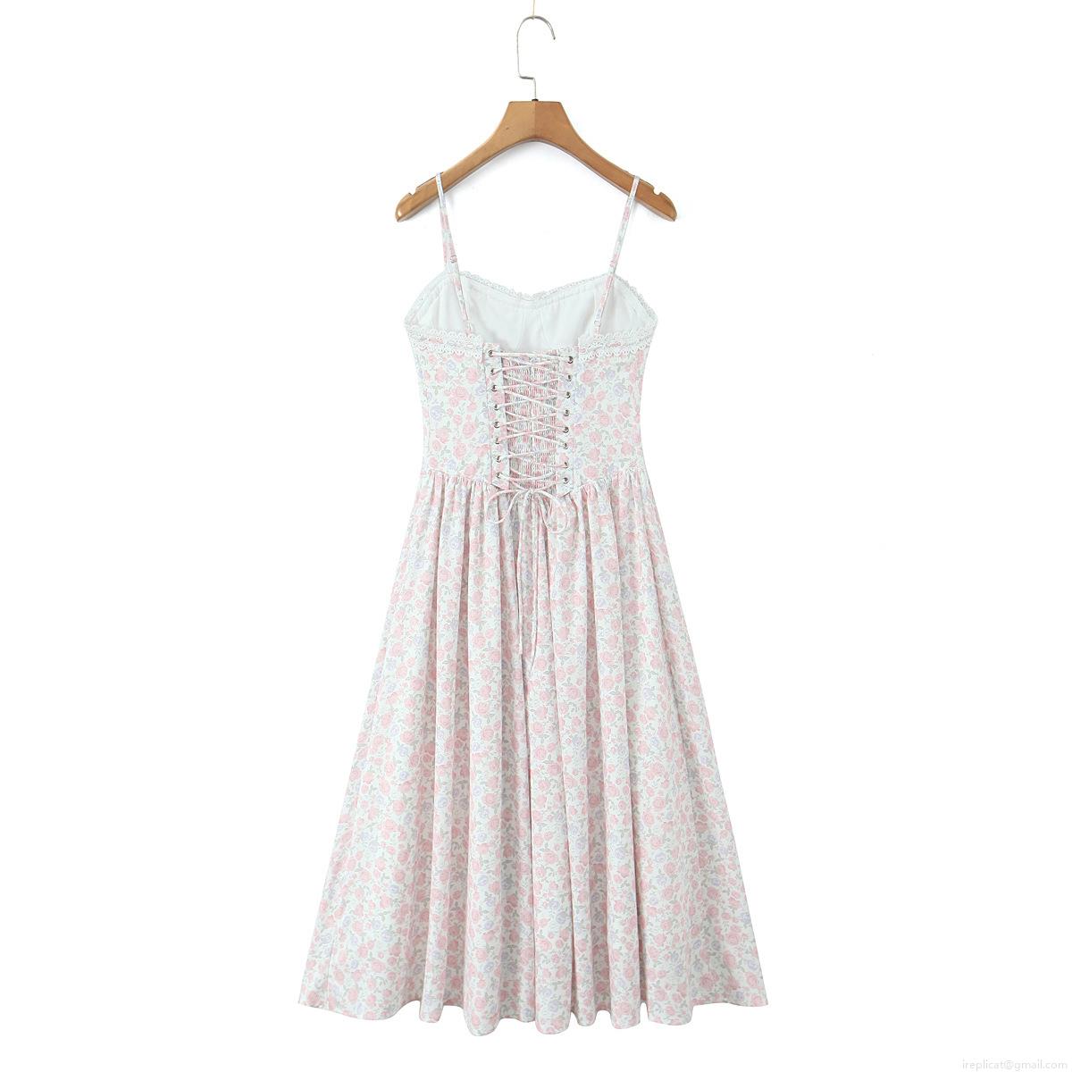 French Vacation Floral Lace Up Slip Maxi Dress Women Summer V Neck Lace Trim Smocked Waist Polyester Chiffon Backless Beach Long Dress