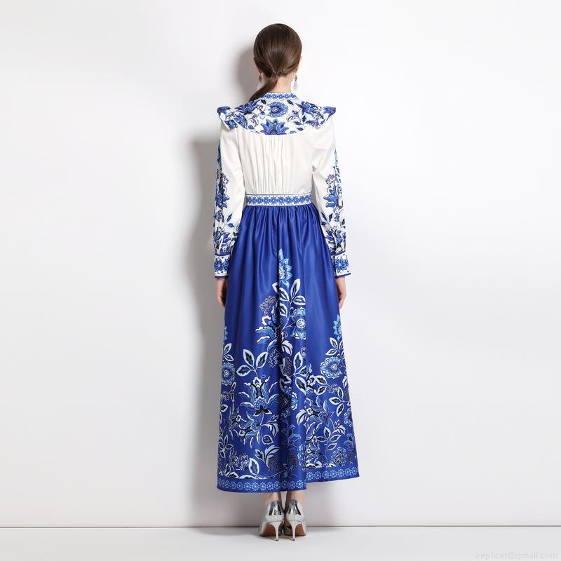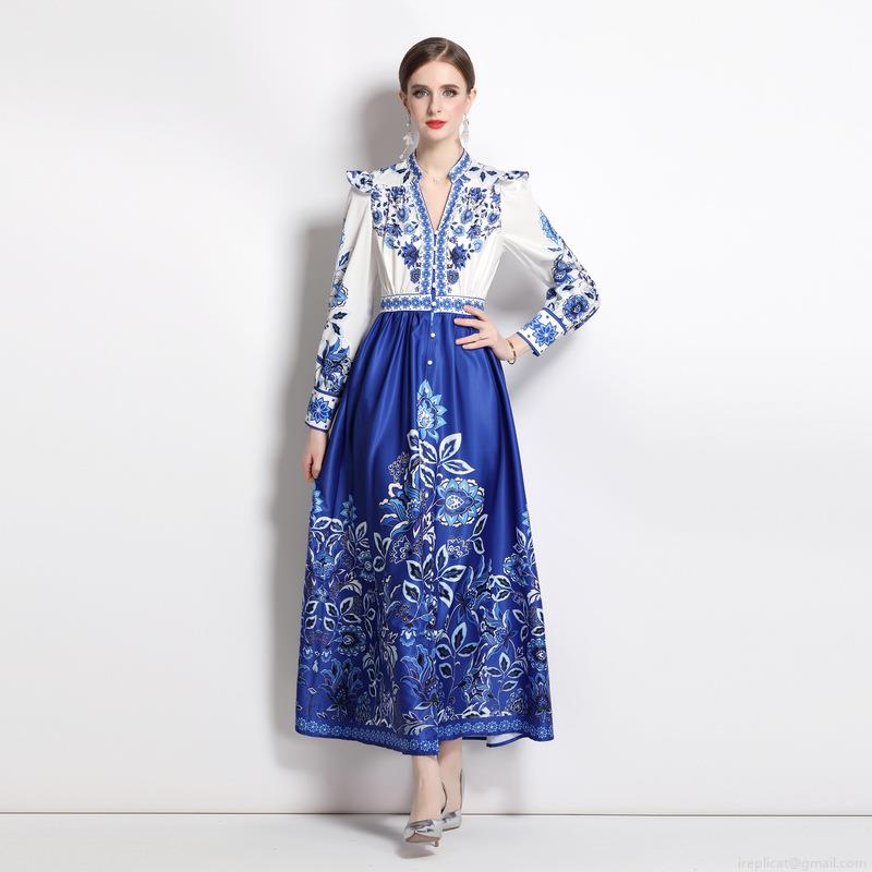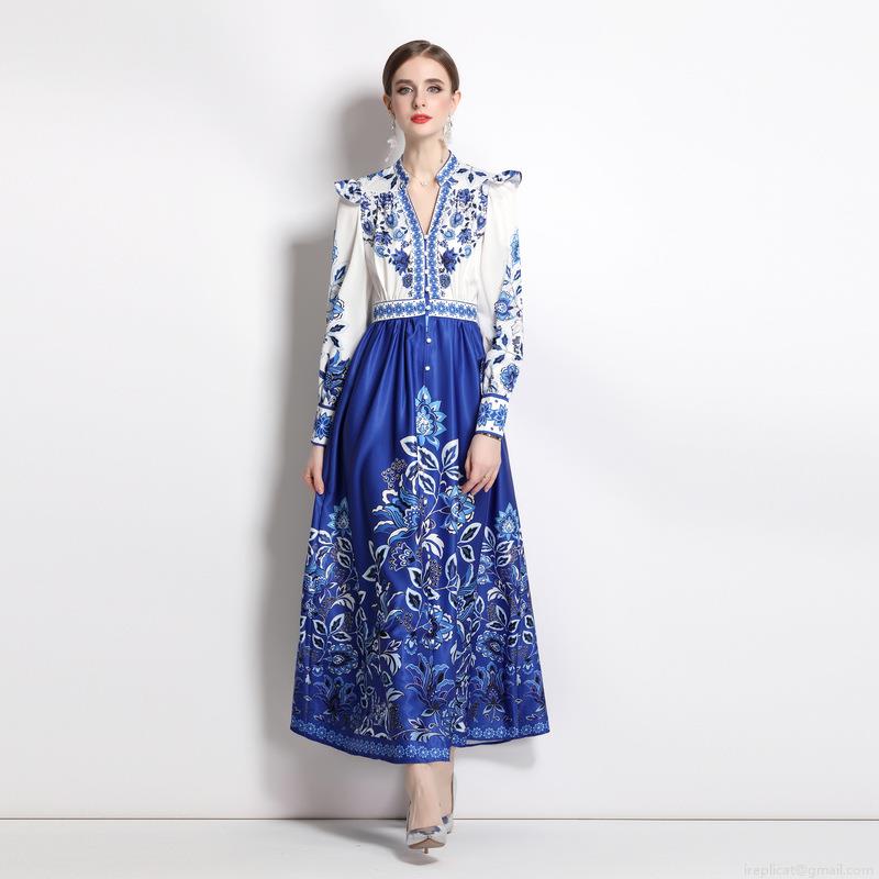 • French Vintage Blue and White Porcelain Print Maxi Dress Elegant V-Neck Long Sleeve Button Down High Waist A-Line Large Swing Satin Dress for Women Party Evening
