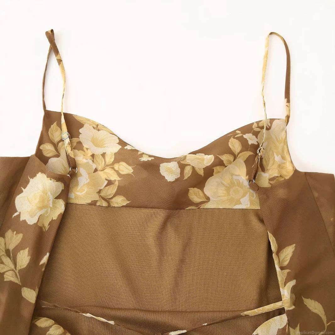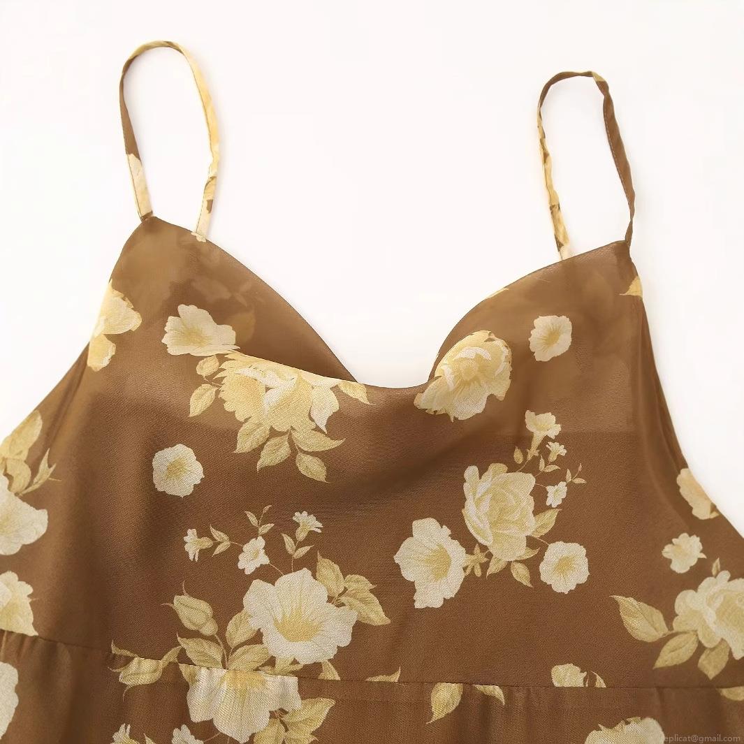 • French Vintage Brown Floral V-Neck Cami Dress For Women 100% Polyester Elegant Slim Fit Asymmetric Ruffle Hem Sleeveless Maxi Dress Party Wear