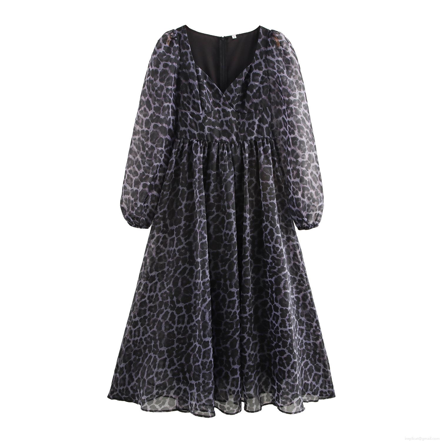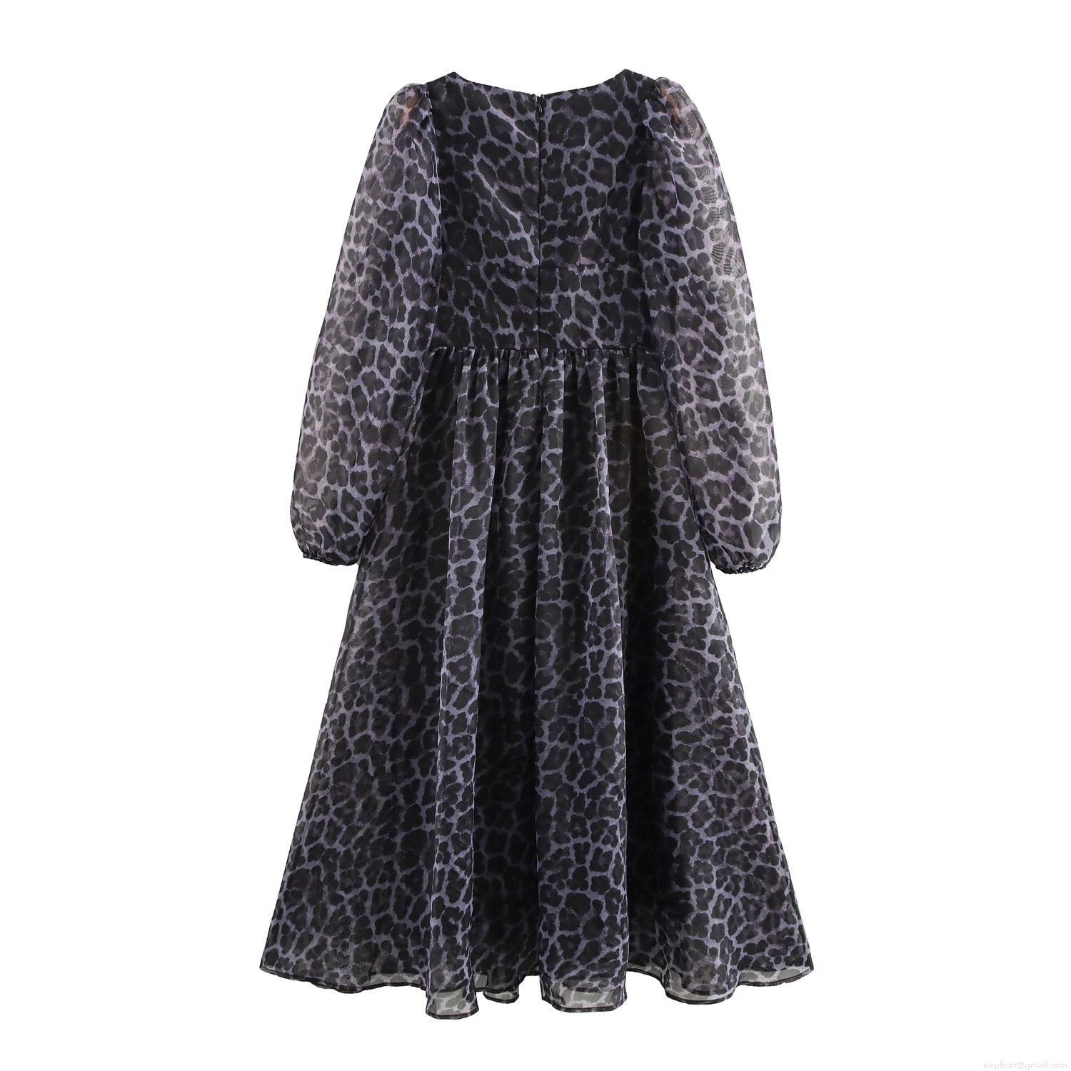 French Vintage Leopard Print Maxi Dress Women Chiffon Organza Long Sleeve Square Neck Slim Fit High Waist Party Dress Long Gown