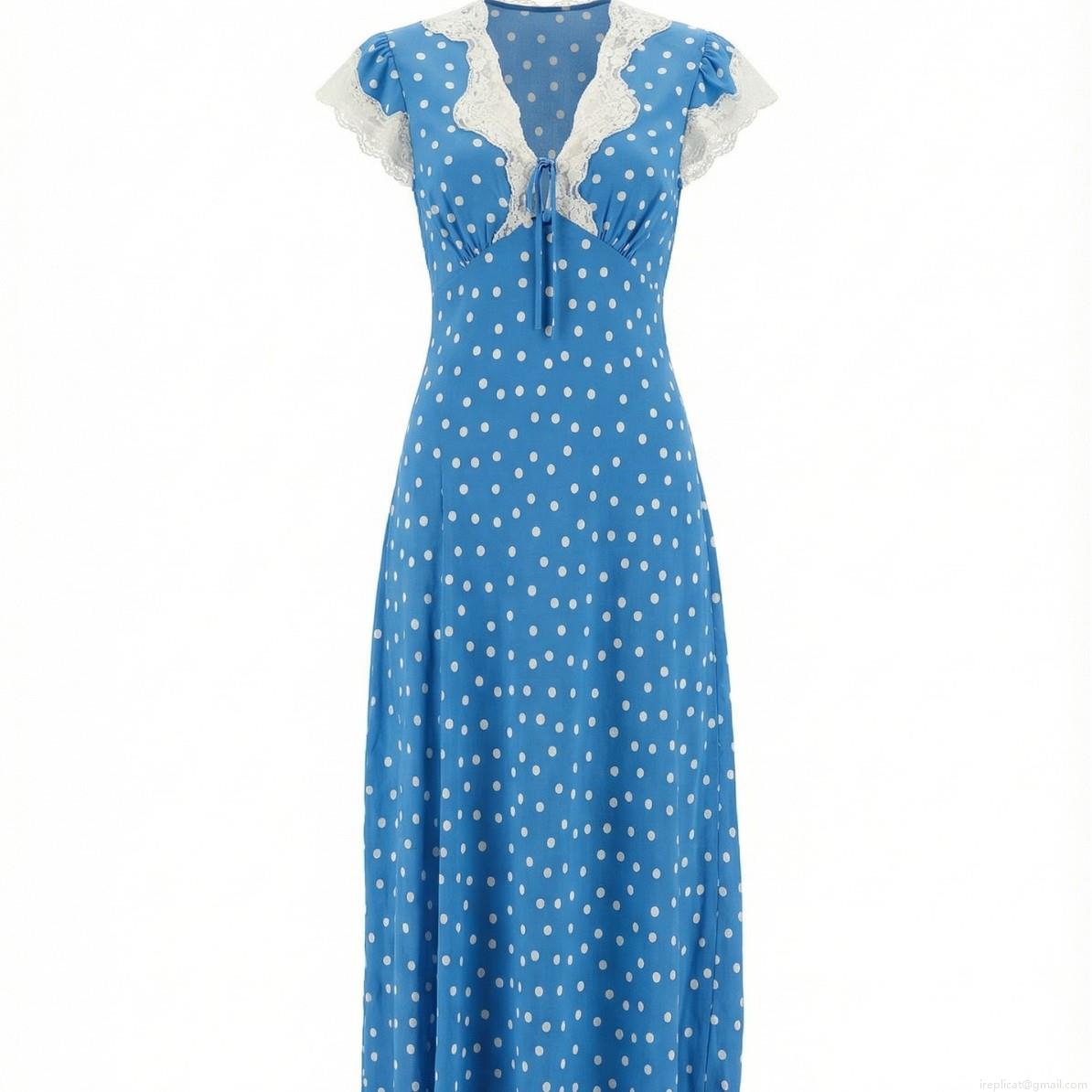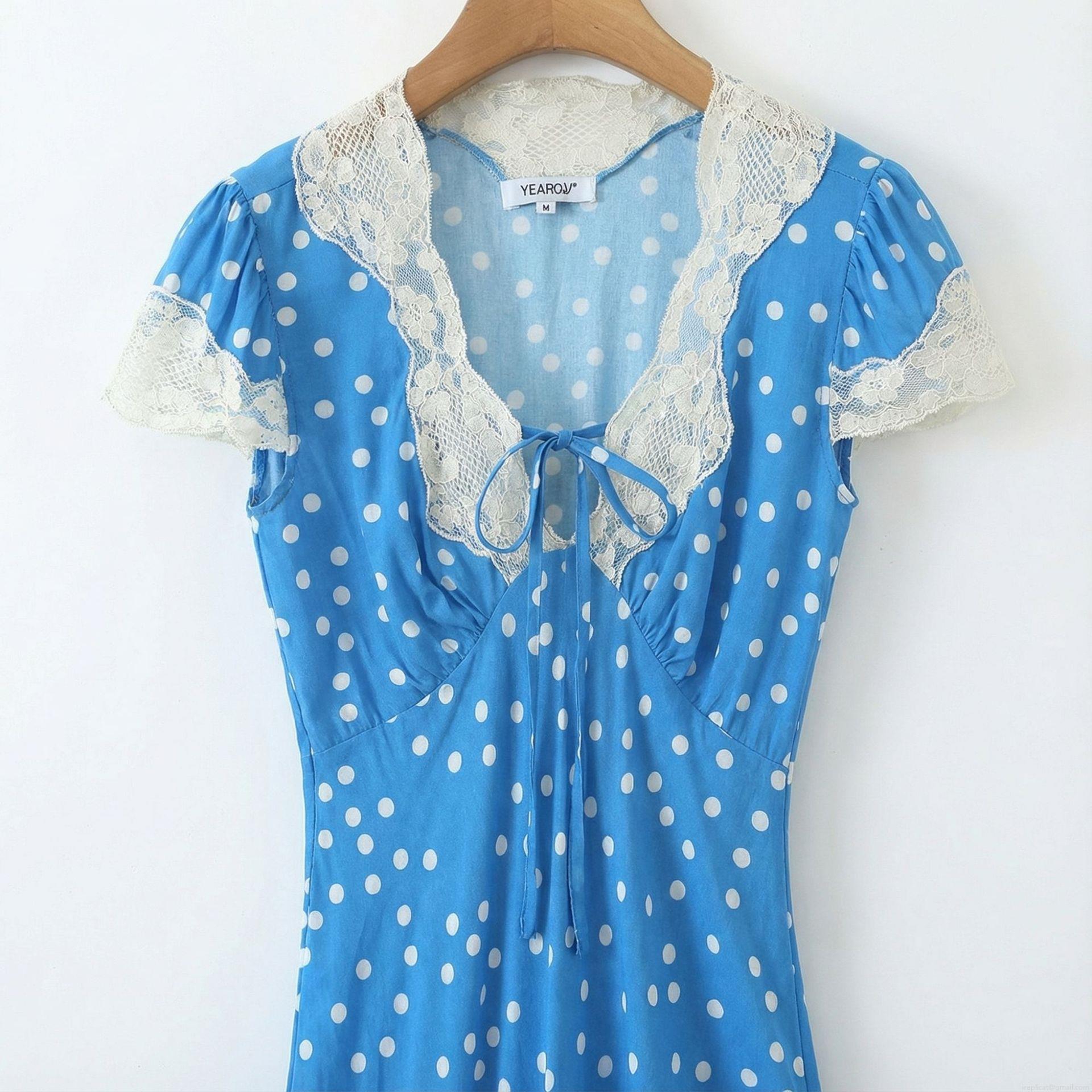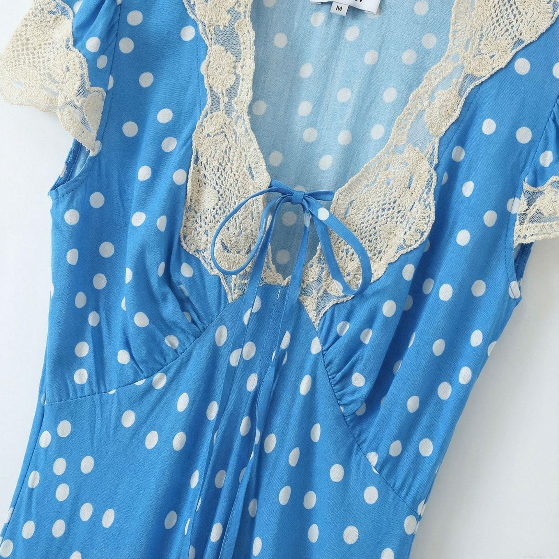 • French Vintage Polka Dot Rayon Maxi Dress With Lace V-Neck Peter Pan Collar Short Sleeve Sweet Retro Vacation Dress For Women