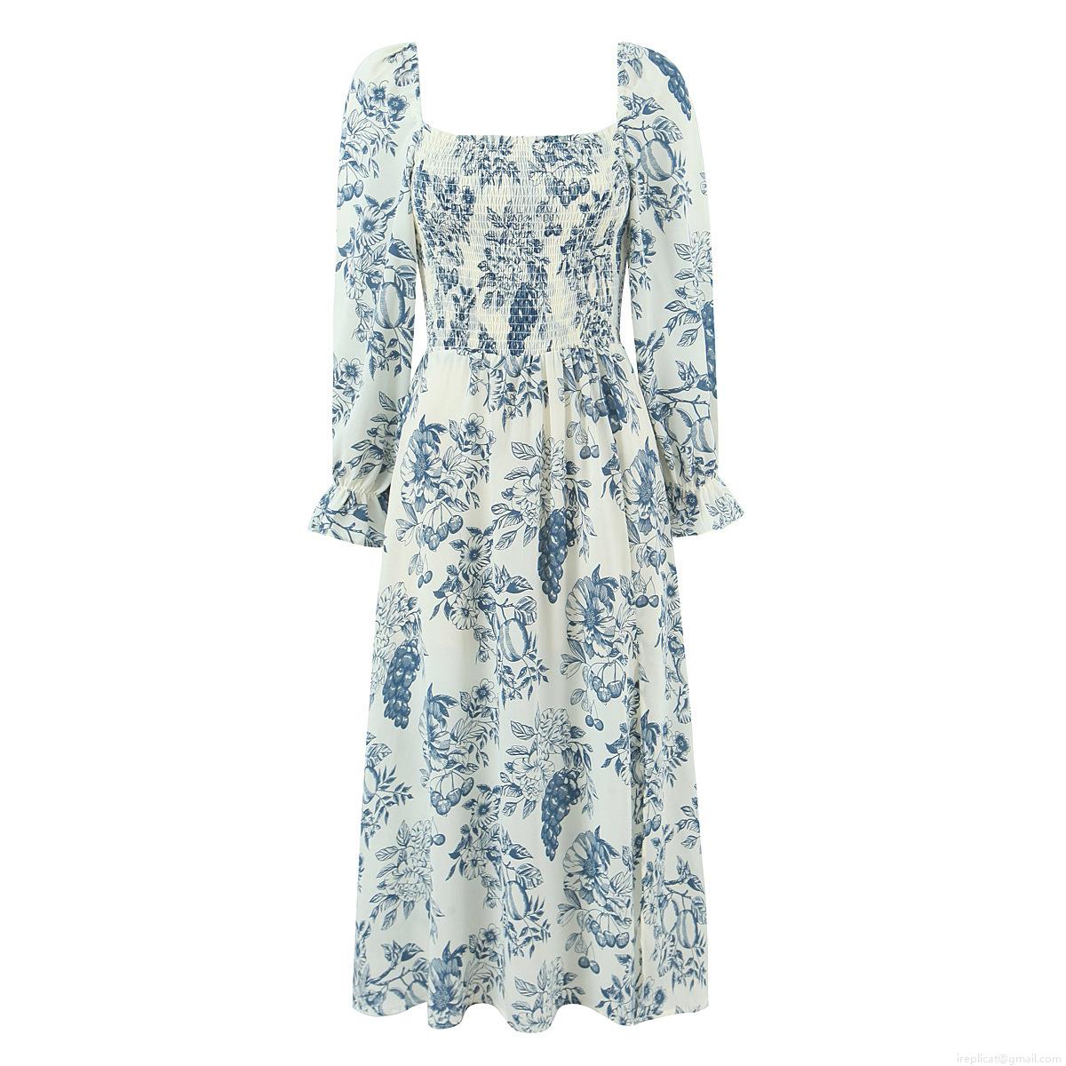 French Vintage Square Neck Long Sleeve Maxi Dress Blue White Toile De Jouy Floral Smocked Elastic Waist Side Slit Dress Women Spring Summer Vacation