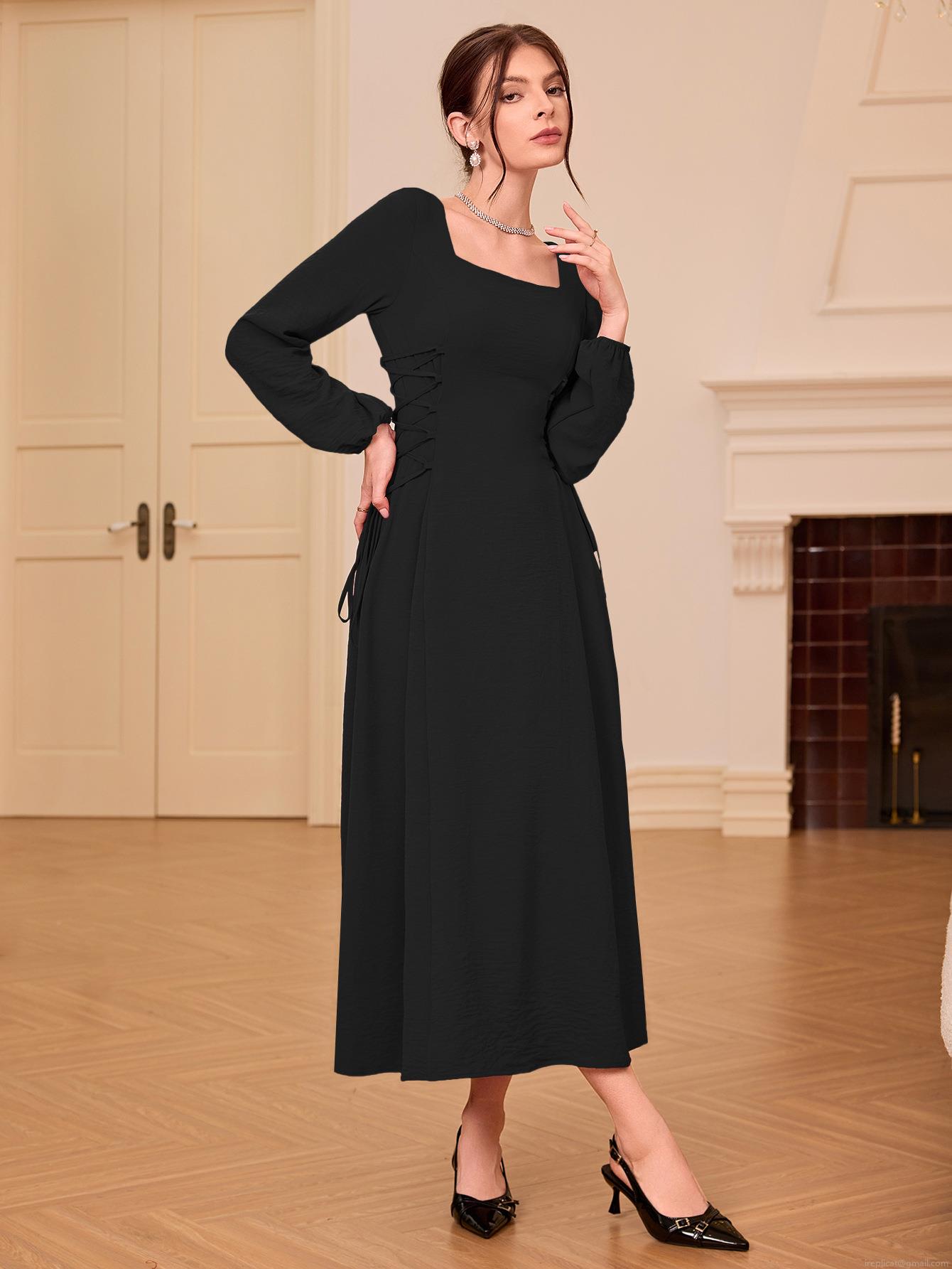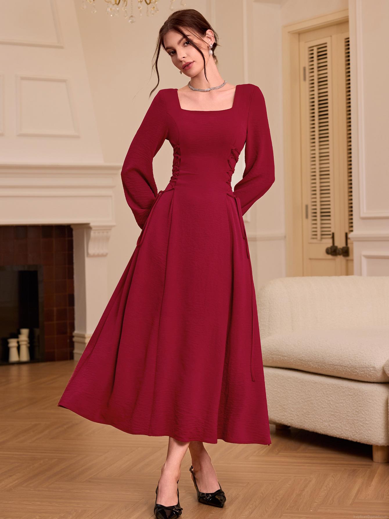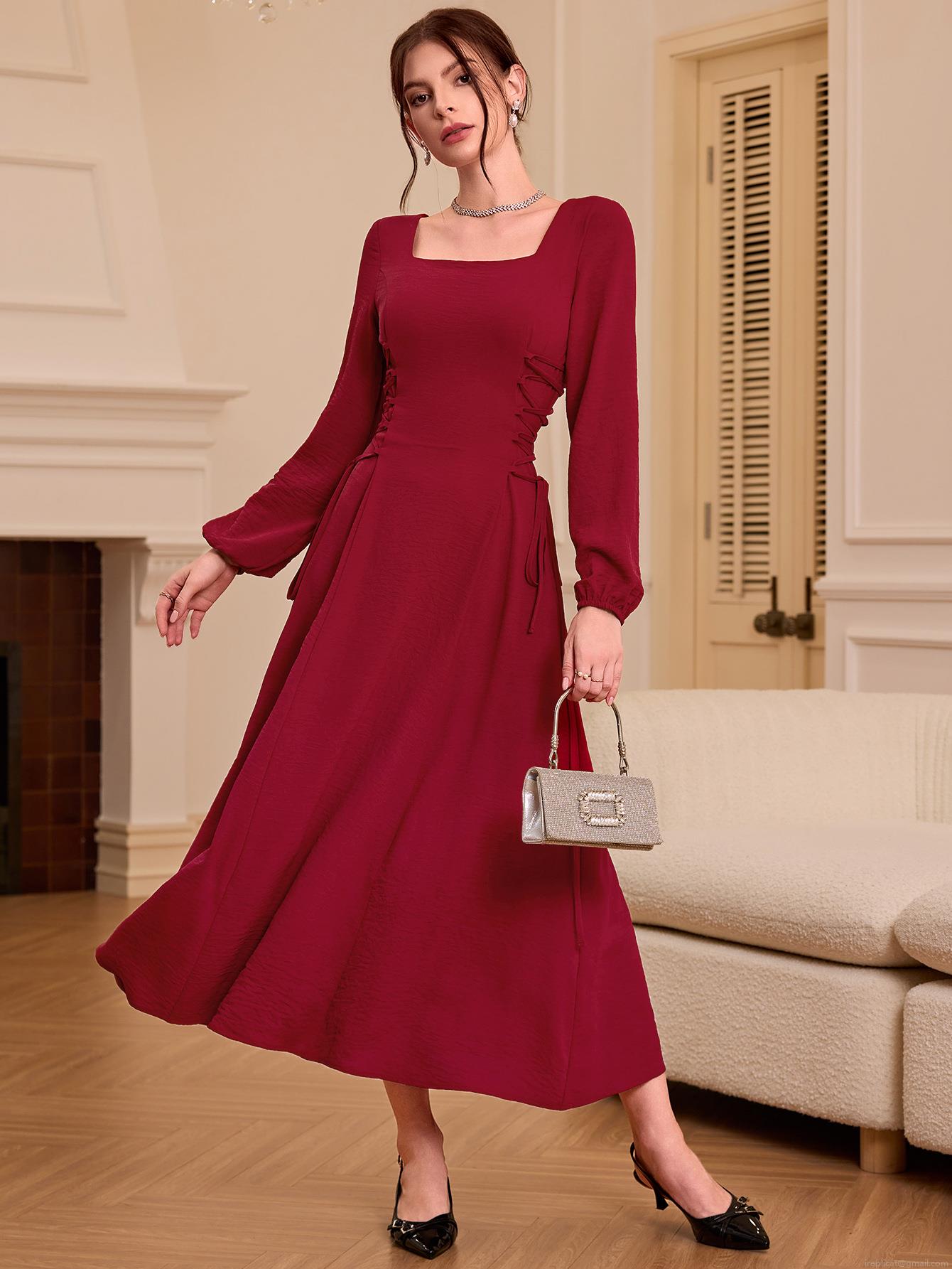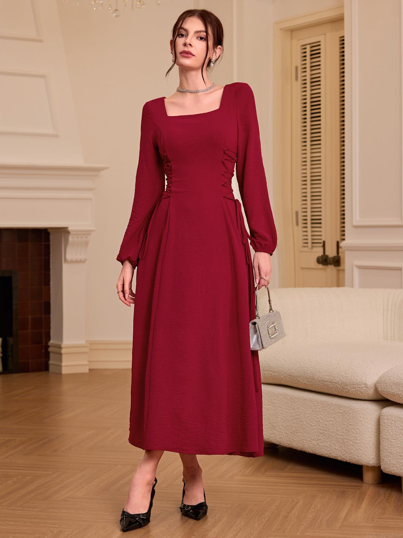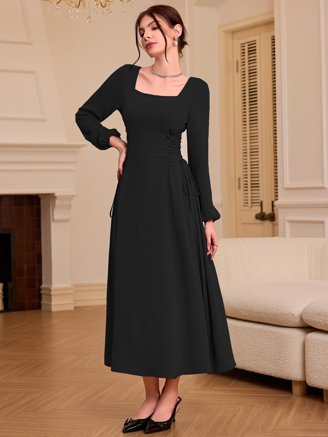 French Vintage Square Neck Long Sleeve Maxi Dress Women Elegant Side Lace Up Slim Fit A-Line Knit Long Skirt For Party Evening Wedding Autumn Winter