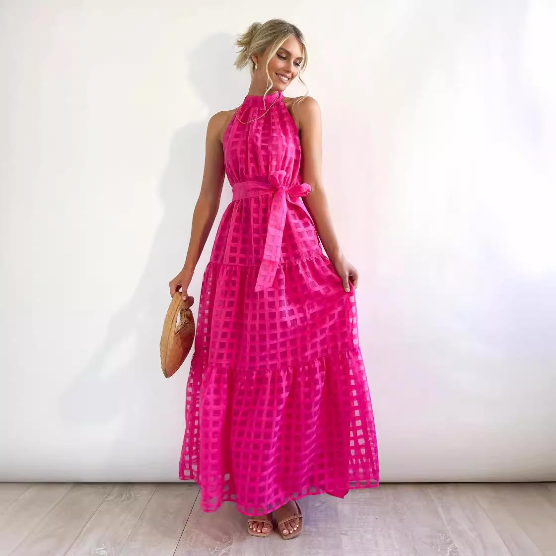 • Halter Neck Tiered Maxi Dress Polyester Checkered Sleeveless Long Dress With Belt Summer Elegant Casual Party Apparel For Women