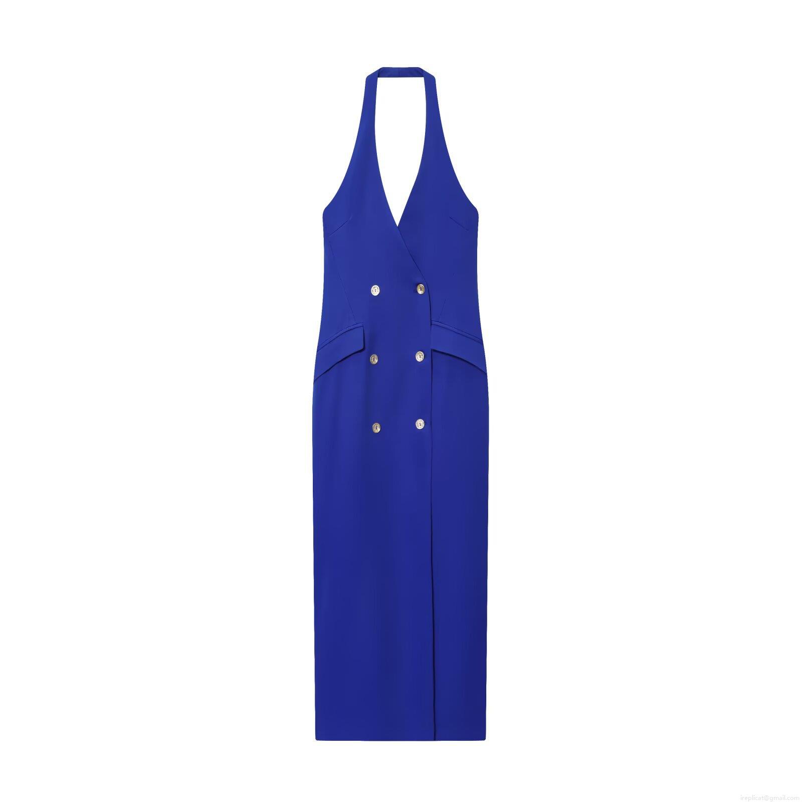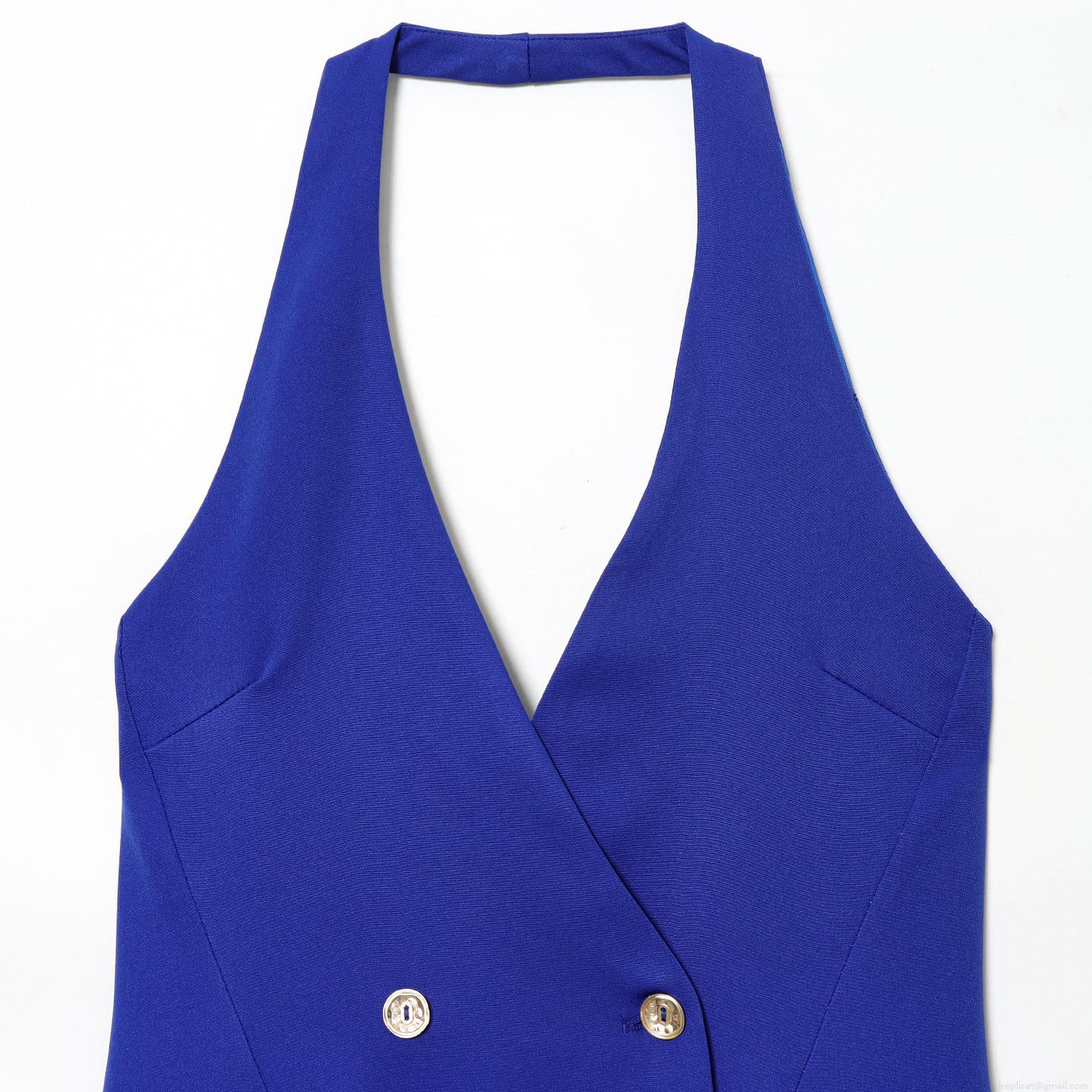 • Maxi Suit Dress Halter Neck Backless Double Breasted Gold Buttons Polyester Solid Royal Blue Elegant Party Evening Dress For Women Sexy Slim Fit Vest Dress