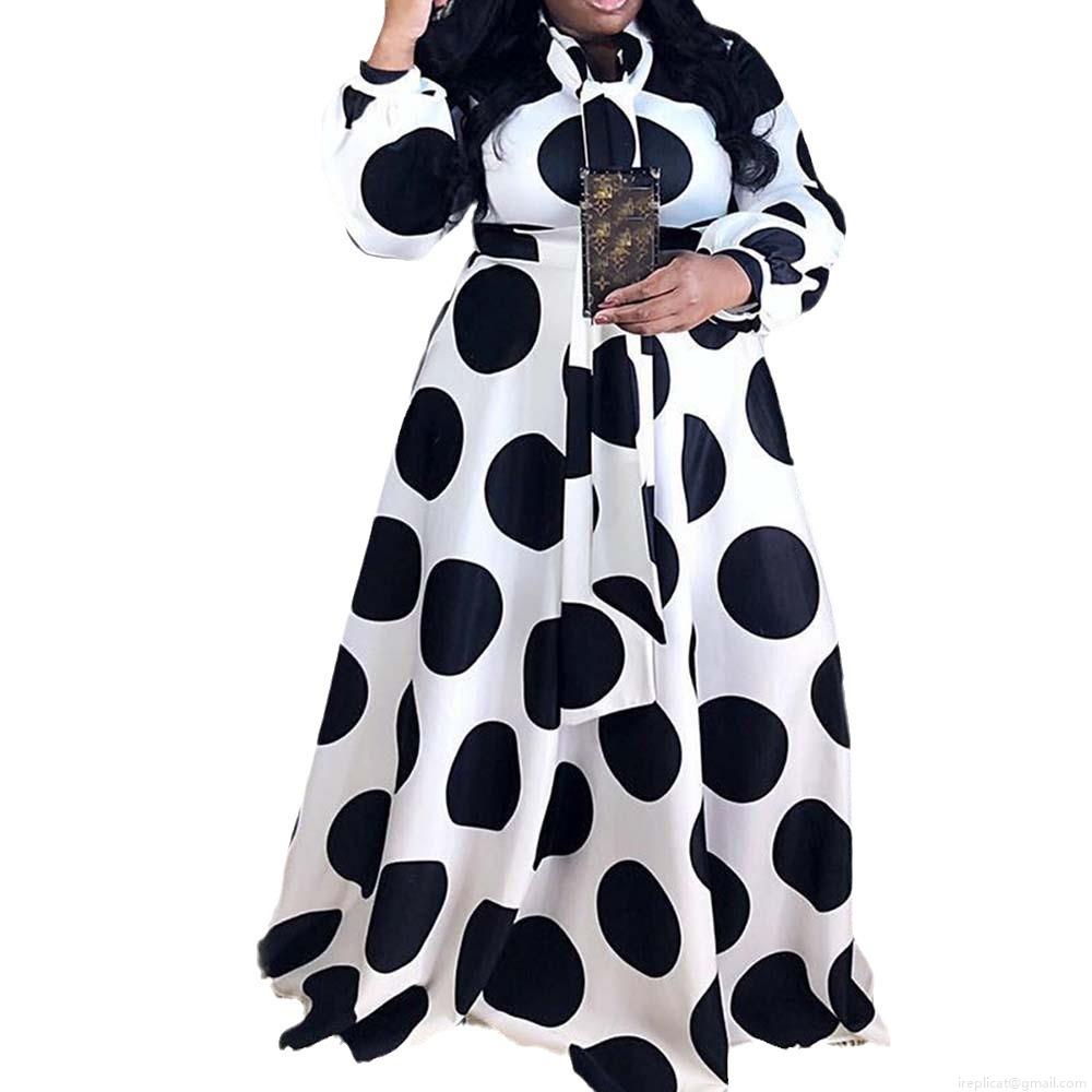 • Plus Size Polka Dot Maxi Dress Women Elegant Long Sleeve Tie Neck African Style A-Line Dress Retro Boho Swing Long Dresses