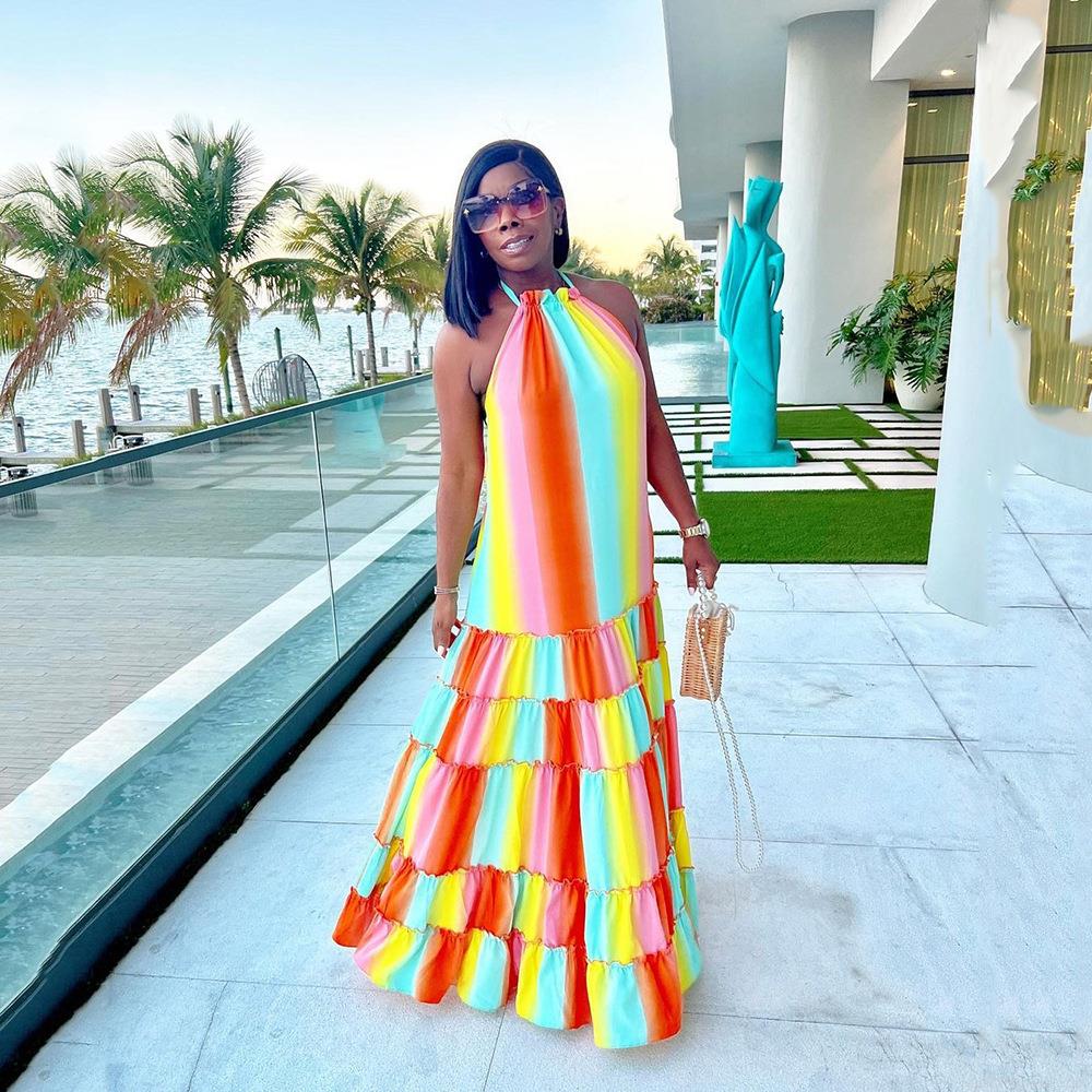 • Rainbow Striped Halter Neck Backless Maxi Dress Bohemian Tiered Cake Skirt Sleeveless Long Dress for Women Summer Beach Vacation