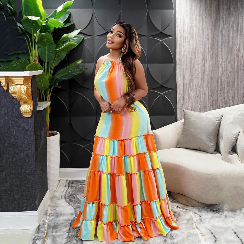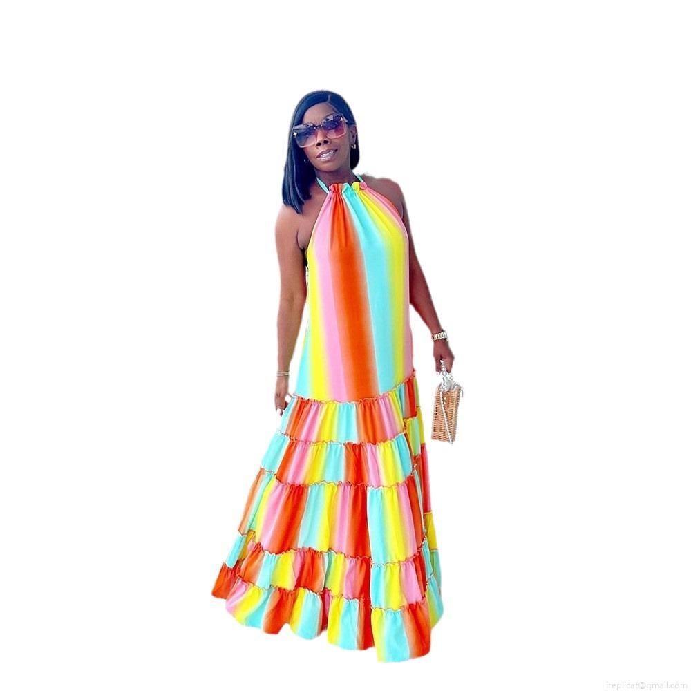 Rainbow Stripes, Pleats, Printing, Neckband, Backless, Gradient Stripes, Multi-tiered Cake Skirt