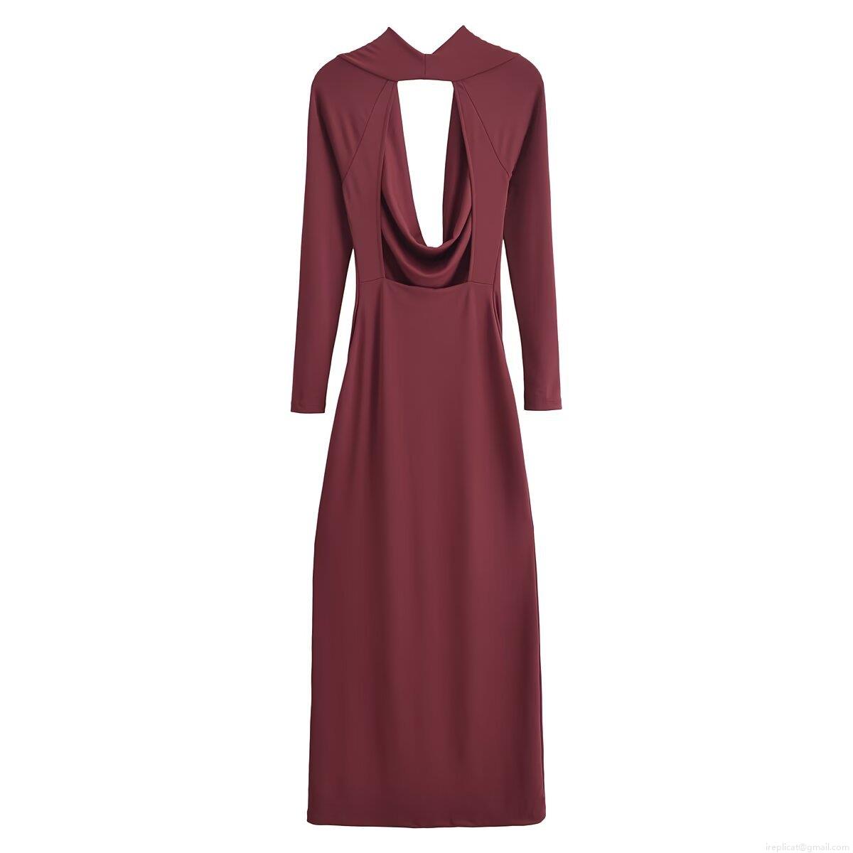 • Sexy Backless Cowl Neck Maxi Dress For Women Slim Fit Long Sleeve Pleated Polyester Dress Party Evening Long Robe Burgundy