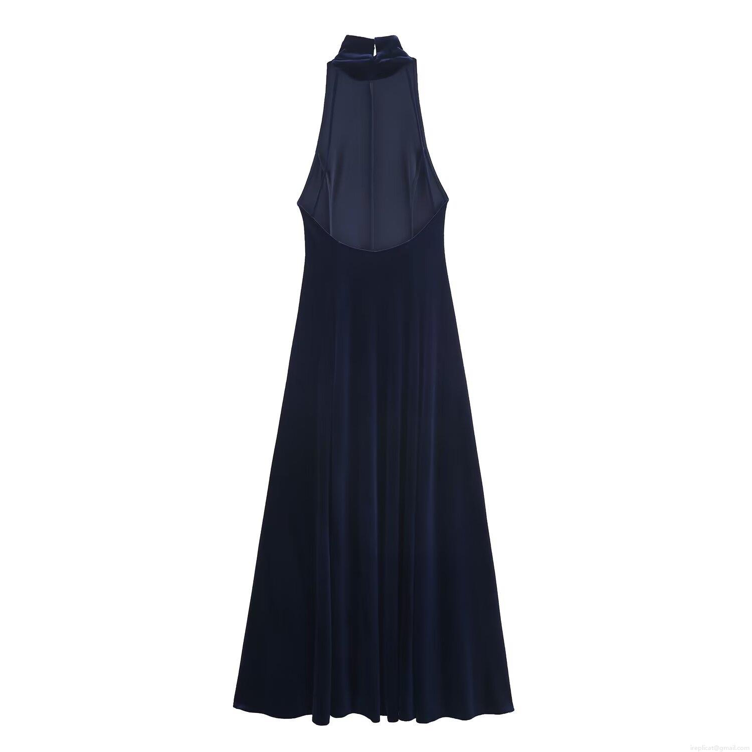 • Sexy Backless Halter Neck Velvet Maxi Dress Elegant Slim Fit Sleeveless Evening Party Gown For Women Deep Blue Solid Color Long Dress