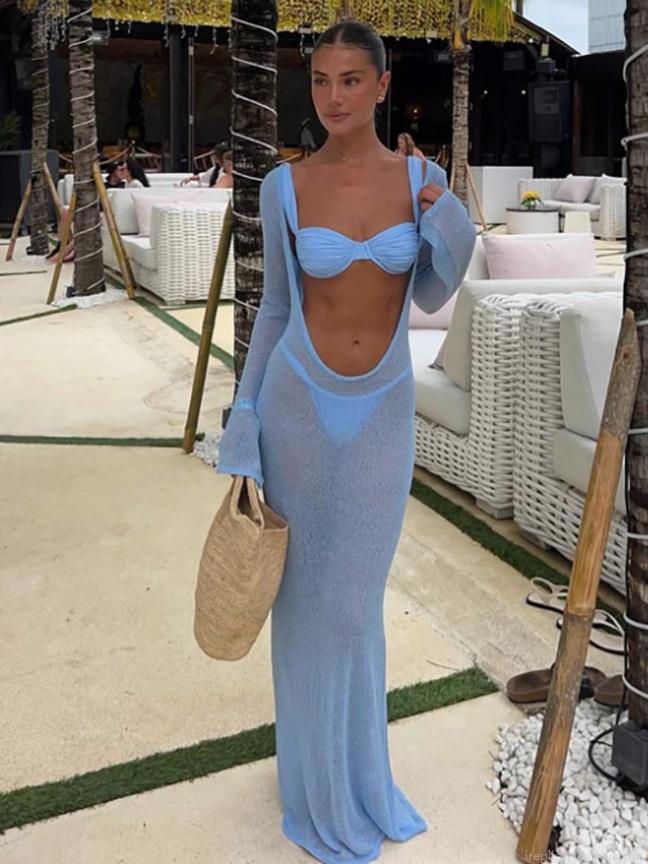 Sexy Backless Hollow Out Knit Beach Dress For Women Long Sleeve Sheer Mesh Crochet Cover-up Maxi Dress Summer Vacation Seaside Party Wear