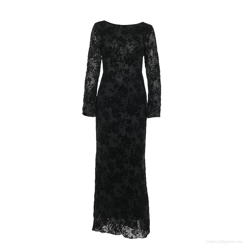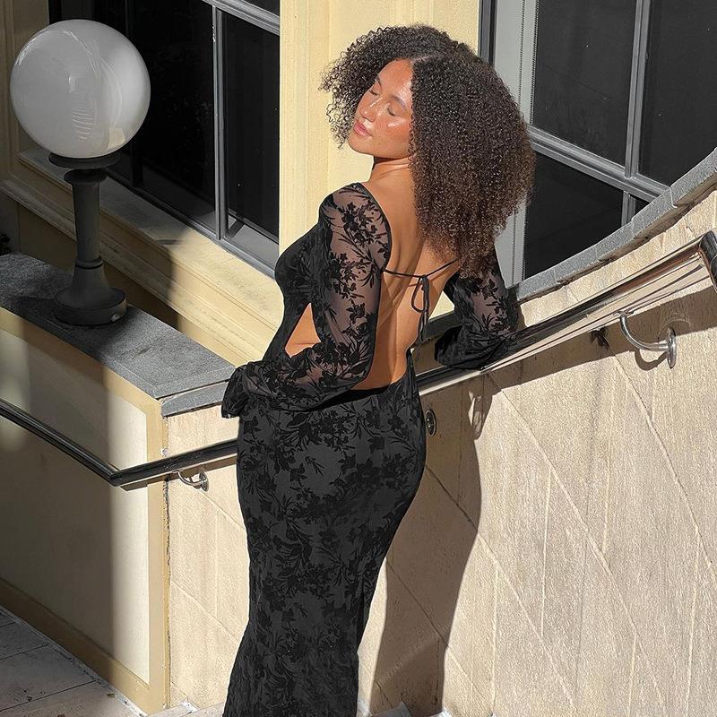 • Sexy Backless Long Sleeve Maxi Dress Floral Lace Burn-out Bodycon Long Dress With Back Tie For Autumn Party Women Celebrity Style
