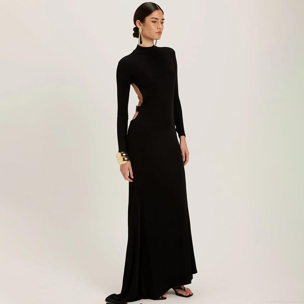 Sexy Backless Maxi Dress Elegant Long Sleeve Solid Black Floor Length Fishtail Dress With Gold Metal Belt For Party Banquet Wedding Evening Women Polyester Gown