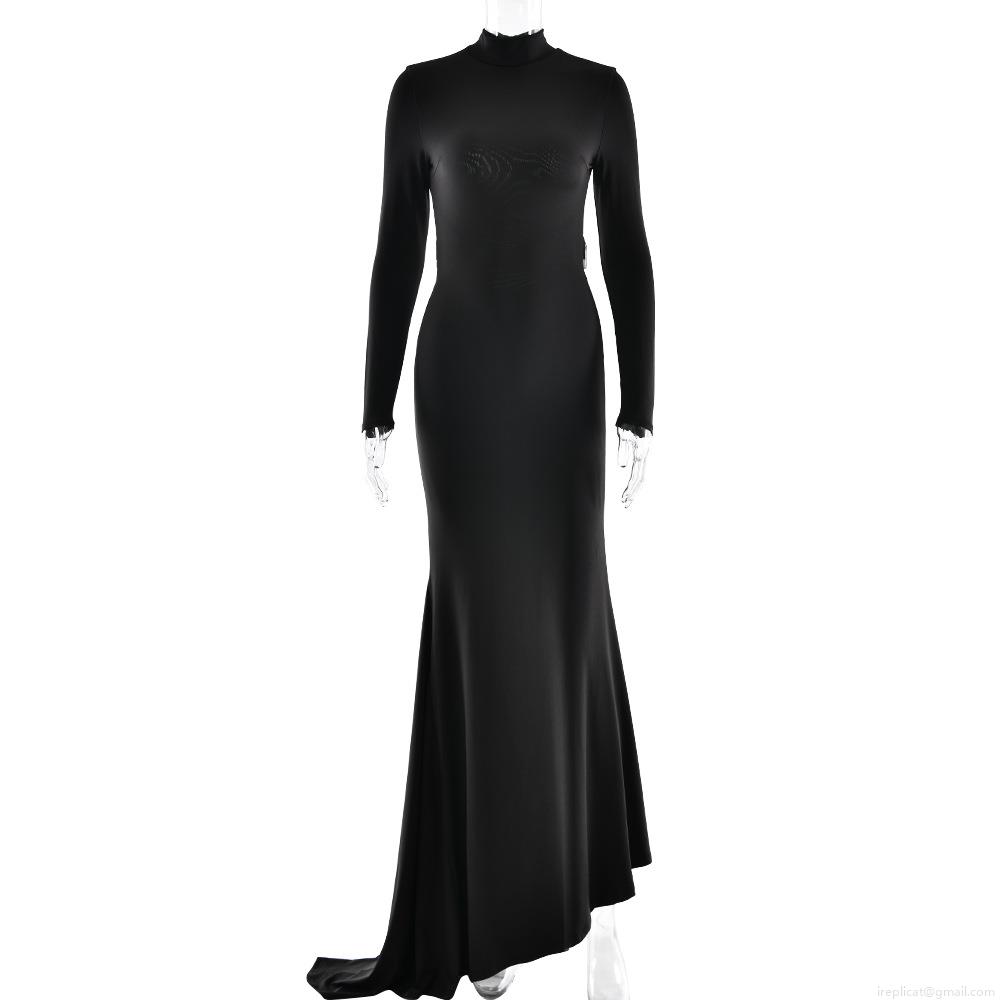 • Sexy Backless Maxi Dress Elegant Long Sleeve Solid Black Floor Length Fishtail Dress With Gold Metal Belt For Party Banquet Wedding Evening Women Polyester Gown